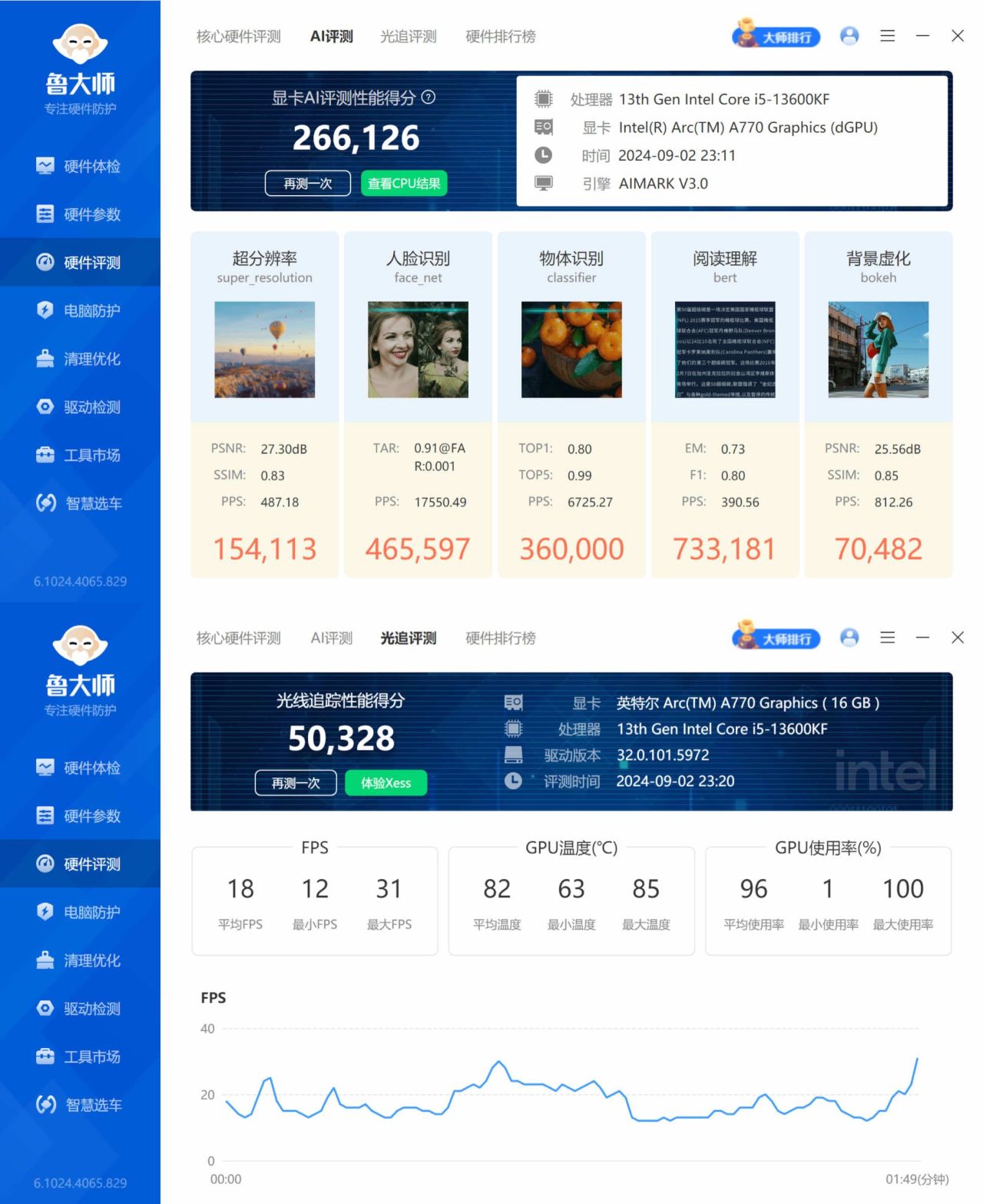 用鲁大师评测软件测试,AI性能评测性能得分:266126(26.6万)分,光线追踪性能得分:50328(5.03万)分。