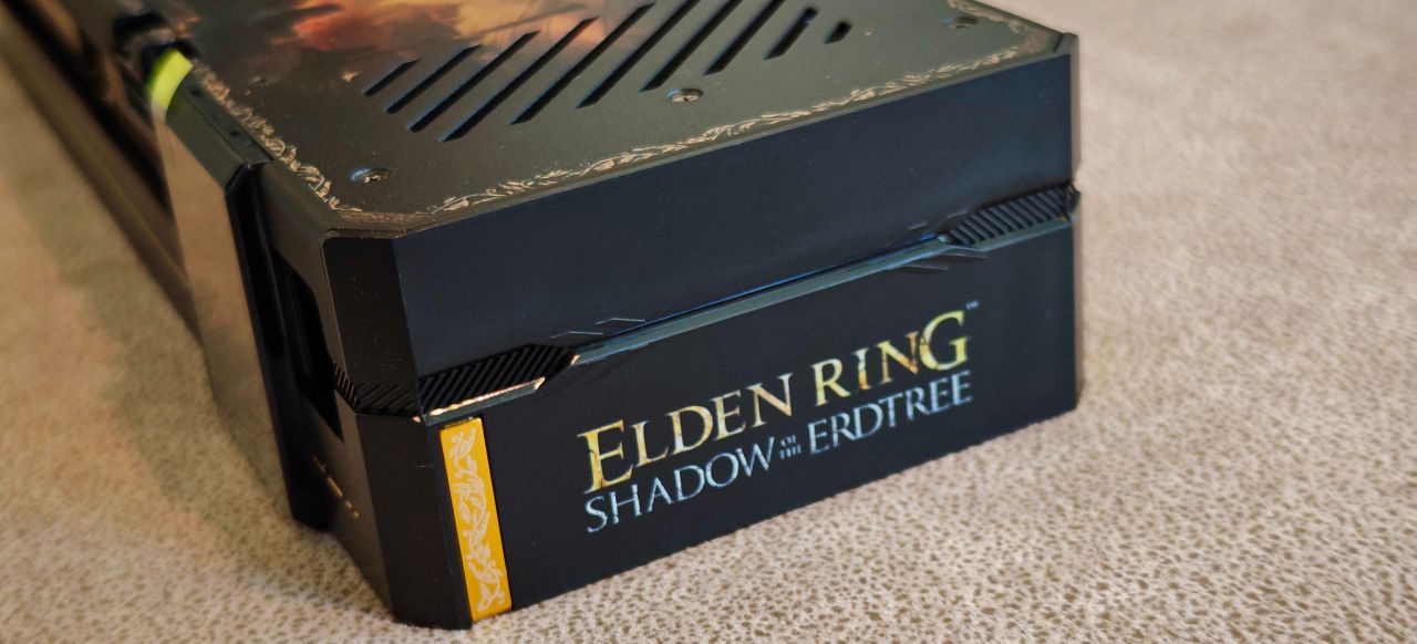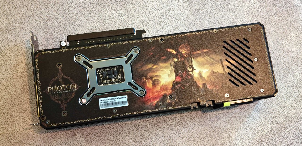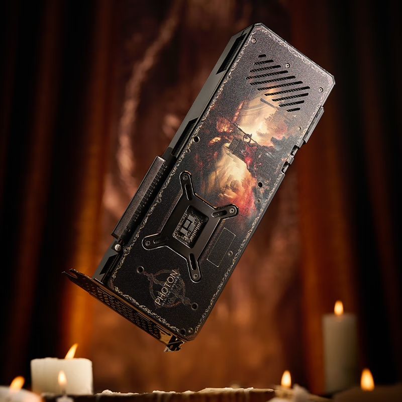 这是一张联名卡,所以显卡的背板上也印有《艾尔登法环:黄金树幽影》的元素。梅瑟莫身处幽影之地的图案被设计成了背板,这是这次DLC宣发的主视角。可以说颜值上显得非常帅气,内容辨识度极高。