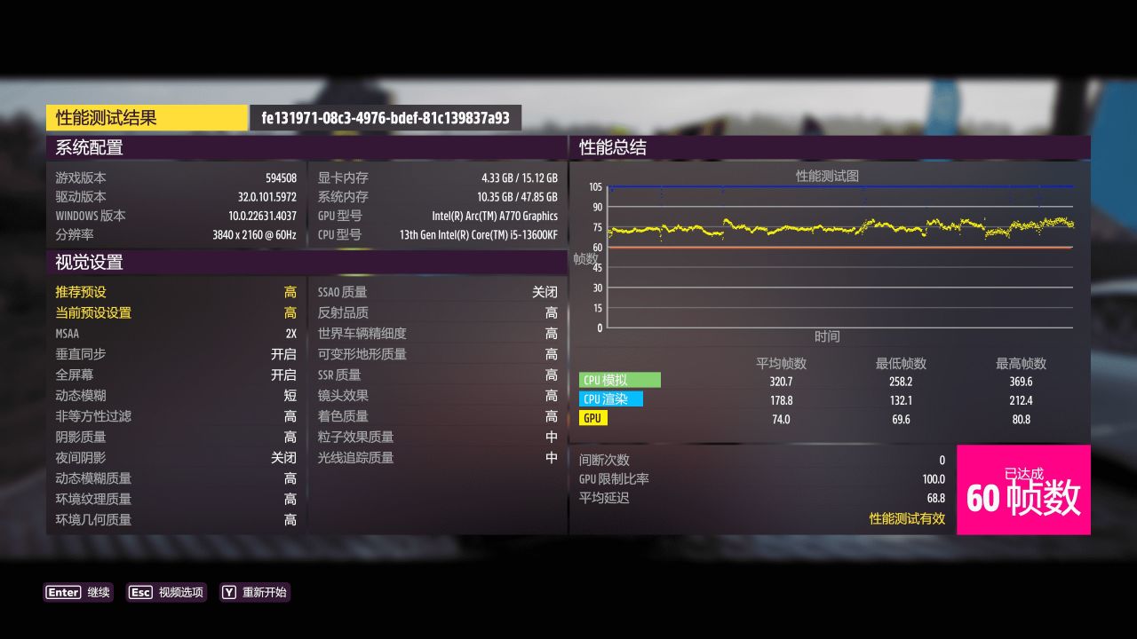 《极限竞速:地平线5》,默认预设高,性能测试有效帧数:60帧。
