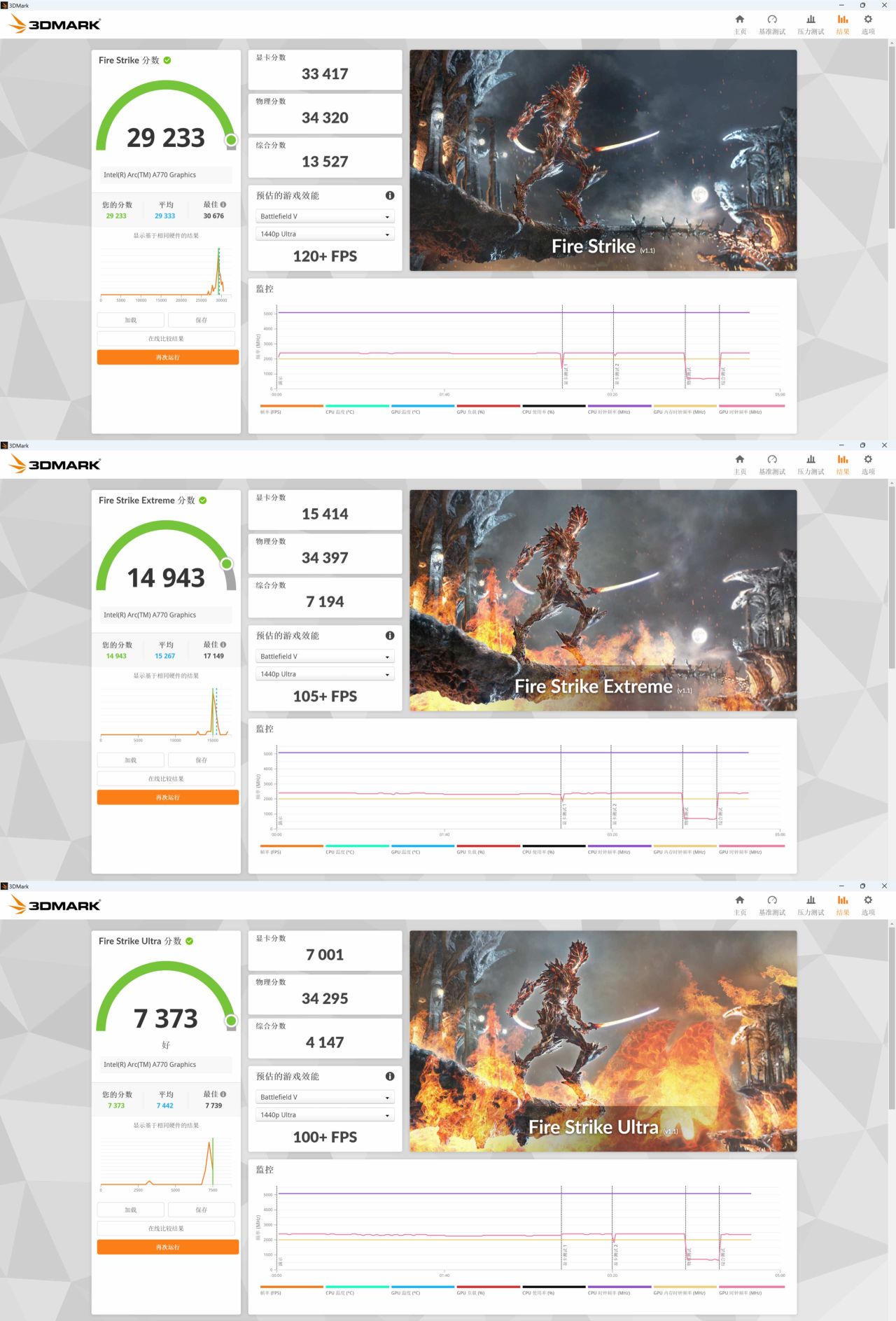 Fire Strike 分数:29233,Fire Strike Extreme 分数:14943,Fire Strike Ultra 分数:7373;