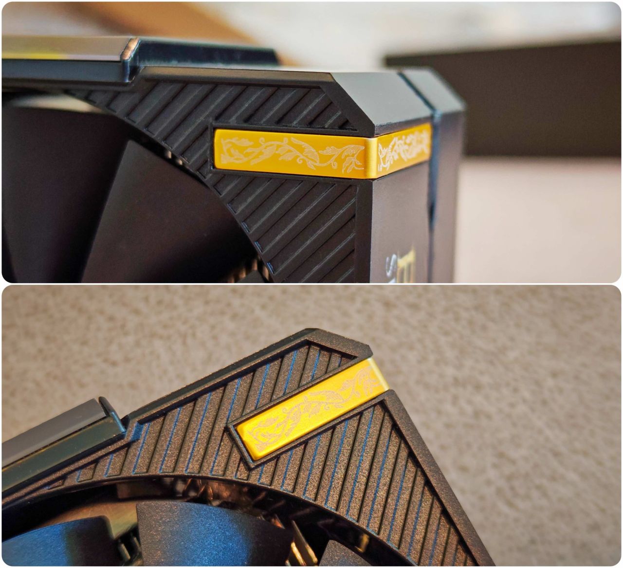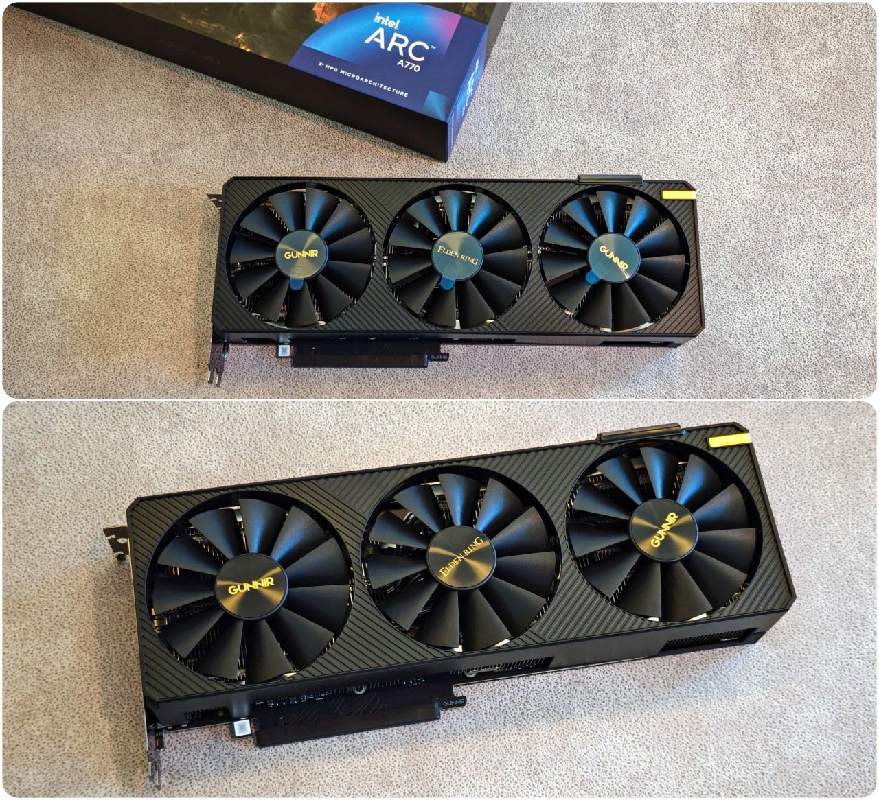 蓝戟的联名卡真是让人眼前一亮,它的外观设计非常出色,采用了经典的黑金配色。在风扇轴心处、侧面L型件等地方都巧妙地融入了艾尔登法环的元素。而且,这三个独立的三帆翼风扇的轴心还贴有标签贴纸,两边的是蓝戟(GUNNIR)的标识,中间的则是老头环(ELDEN RING)的标识。