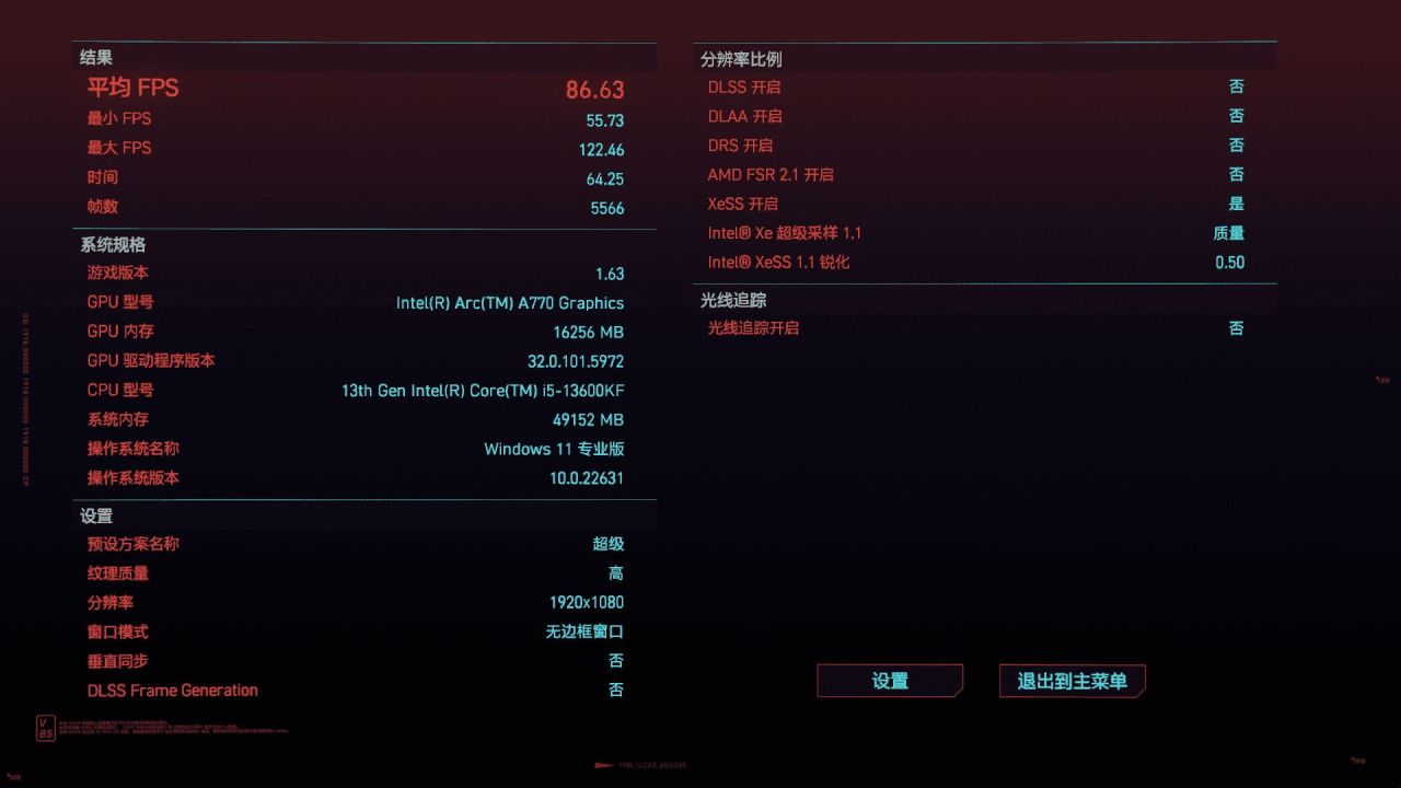 选择《赛博朋克2077》,默认1080P分辨率下,默认预设超级,开启XeSS为质量,平均帧达到了86.63 FPS,选择不开光追完全是可以流畅运行。