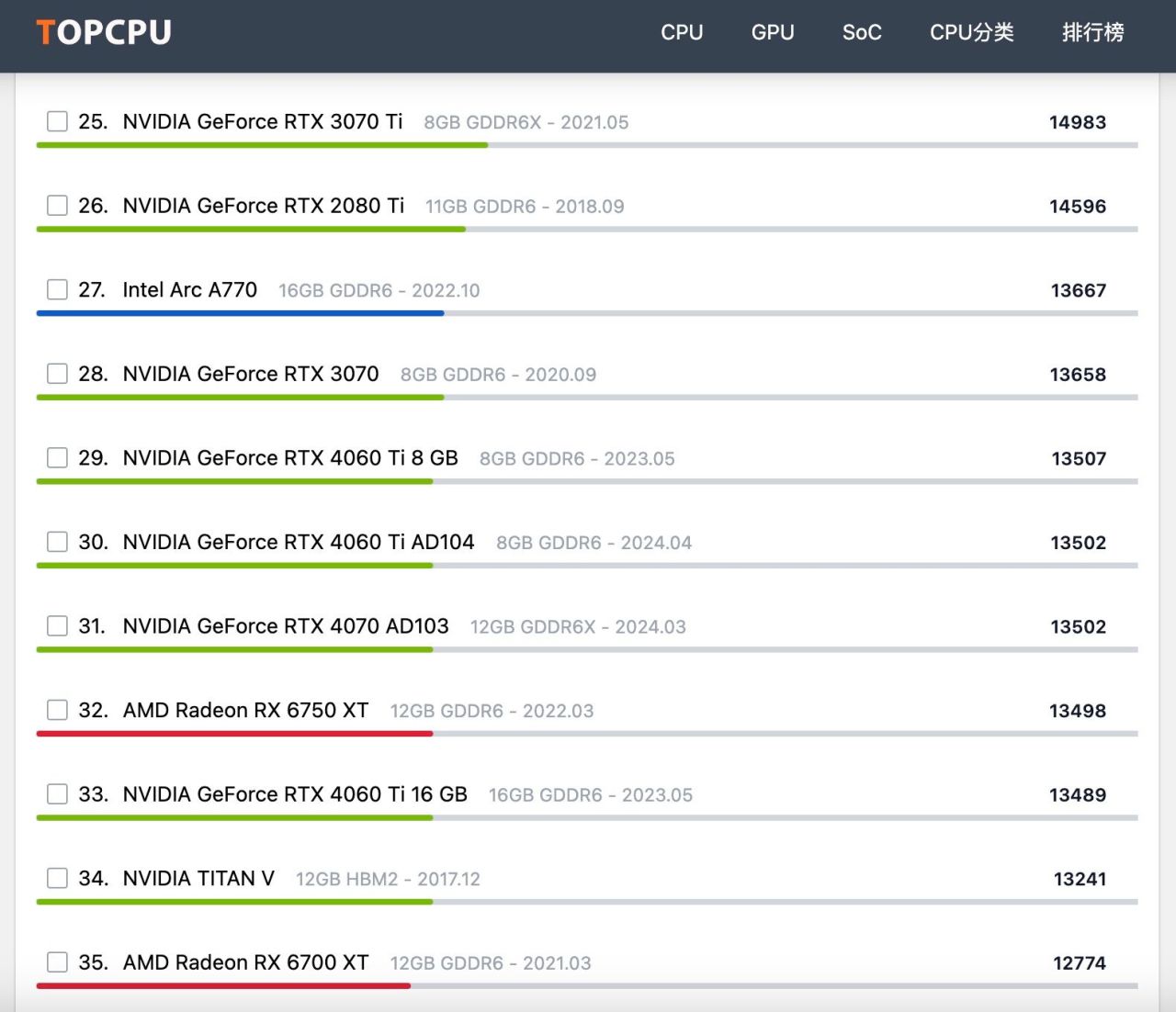 在3DMark Time Spy项目测试中,Intel Arc A770性能还是十分不错的,排行榜数据来源于topcpu。