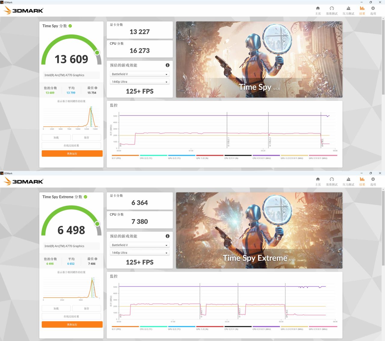 Time Spy 分数:13609,Time Spy Extreme 分数:6498;