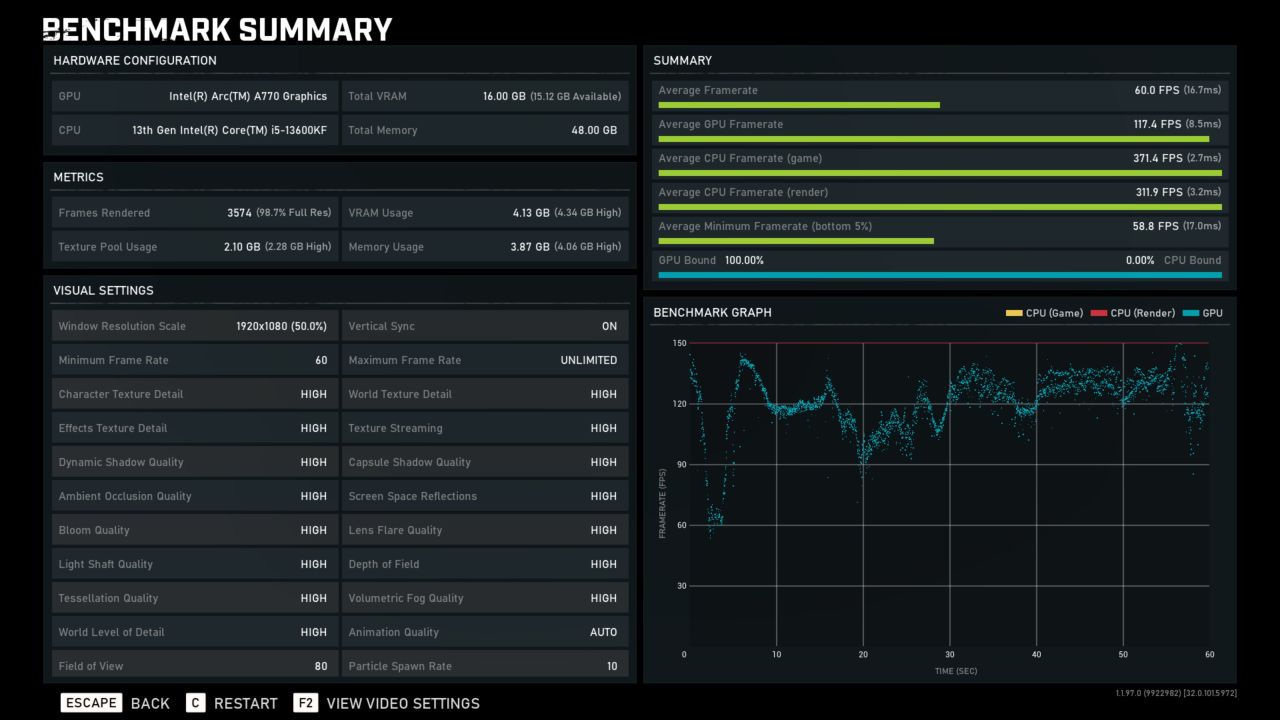 选择《GEAR 5》,默认1080P分辨率下,默认预设HIGH,平均帧达到了117.4 FPS,蓝戟A770也是能够满足游戏体验的。