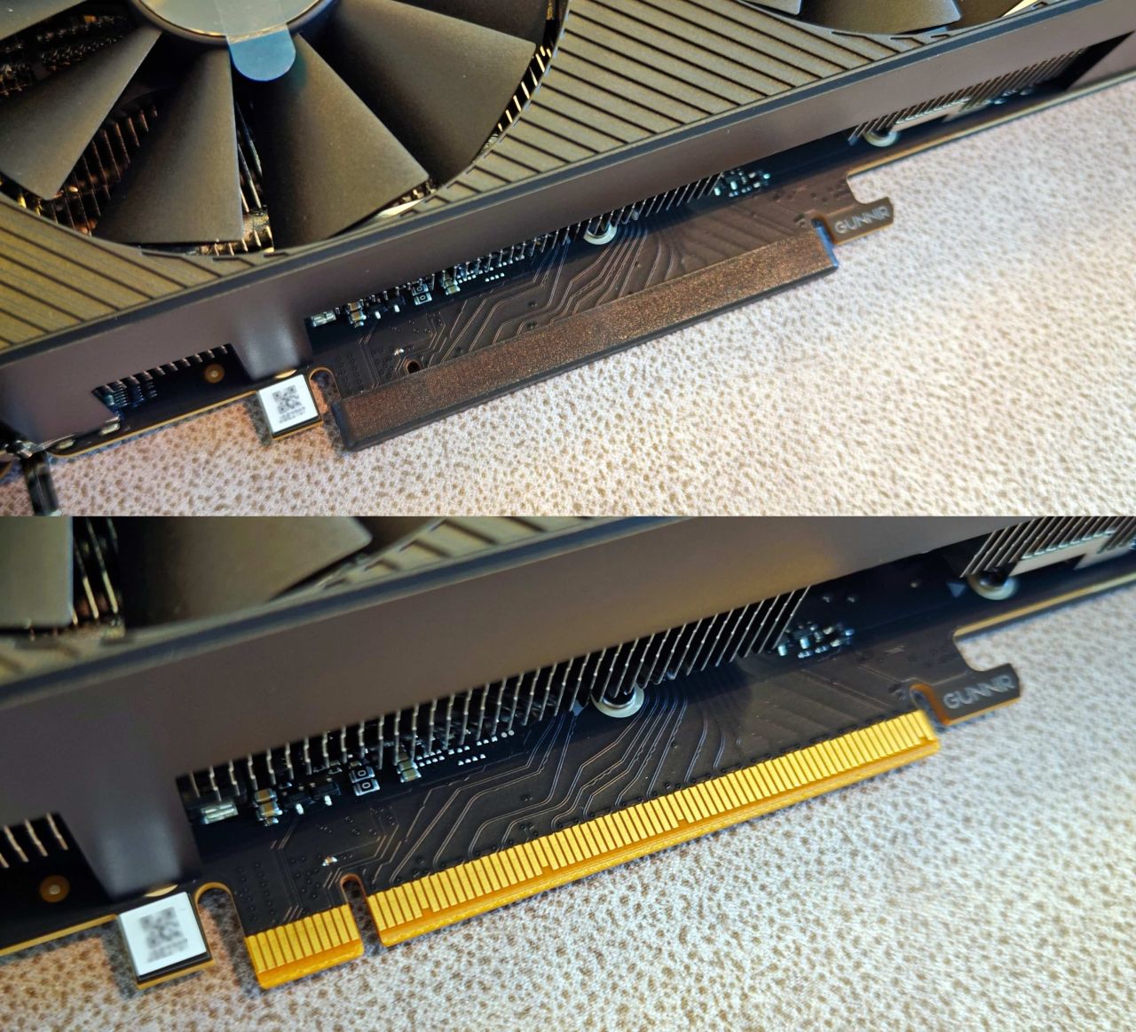 蓝戟高端显卡在出厂时,都会在包装静电袋内给显卡的金手指覆盖上一层保护胶盖,这样可以在运输过程中防止磕碰,而且即使不安装使用显卡,这个保护胶盖也能防止显卡的金手指氧化。