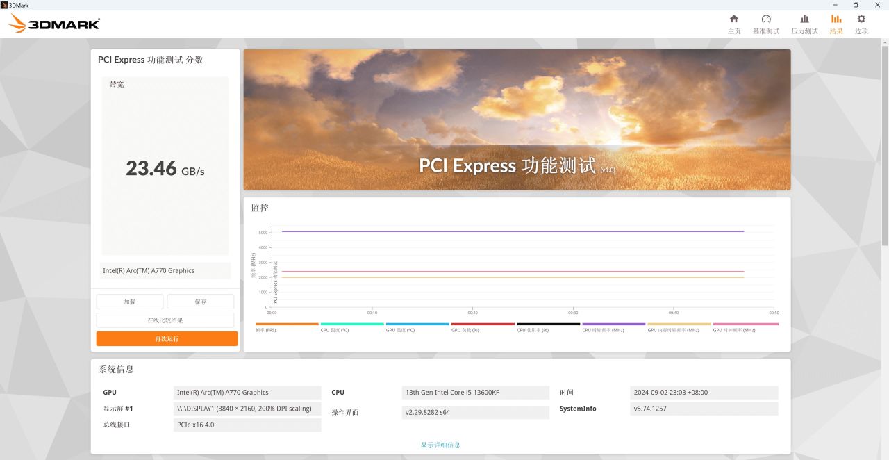 通过3DMark 11软件测试可以看到蓝戟A770 16GB显卡PCI Express 功能测试,带宽:23.46 GB/s。