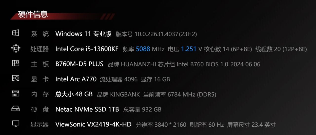这个是手中的硬件配置平台,13代酷睿i5-13600KF+B760主板搭配蓝戟A770显卡,性能完全足够。