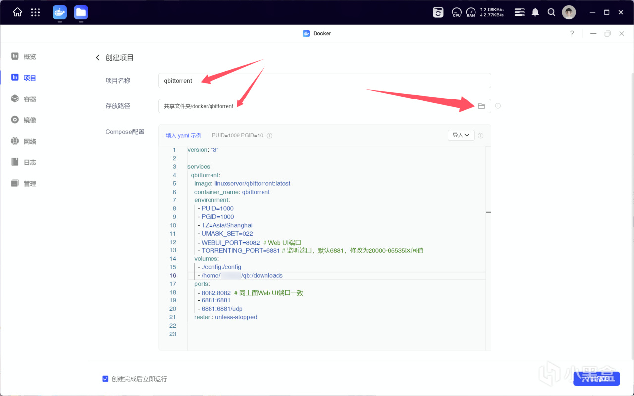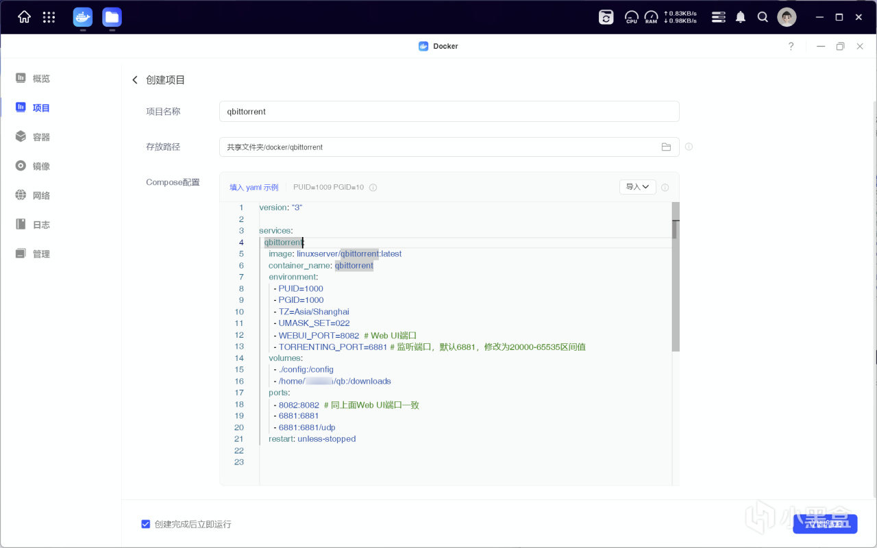 命名完后,下面的【存放路径】会根据命名自动在docker专属文件夹下创建一个存放路径,文件夹名称与项目名相同,表示为该项目的数据配置存放文件夹,改变项目名存放路径也会自动随之变化。当然也支持点击右侧的文件图标,手动指定位置。