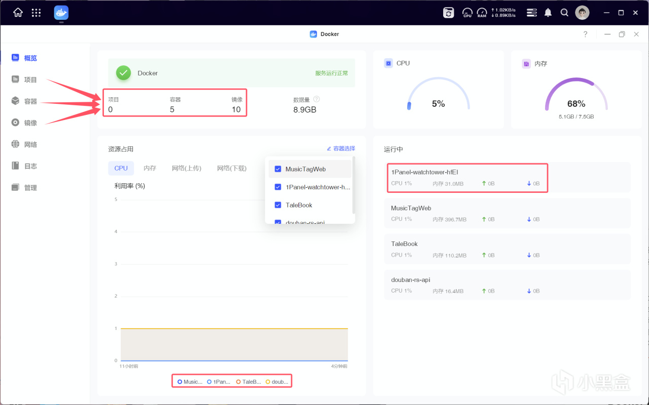 【项目】、【容器】、【镜像】,分别对应左侧栏那几个,点击对应的数字即可跳转过去;