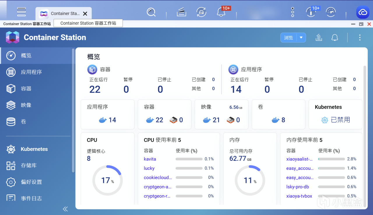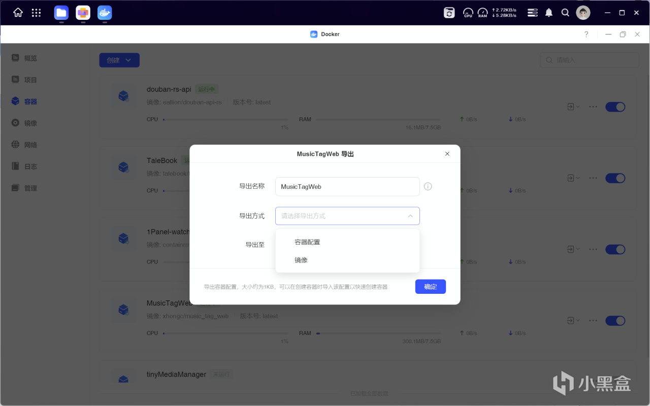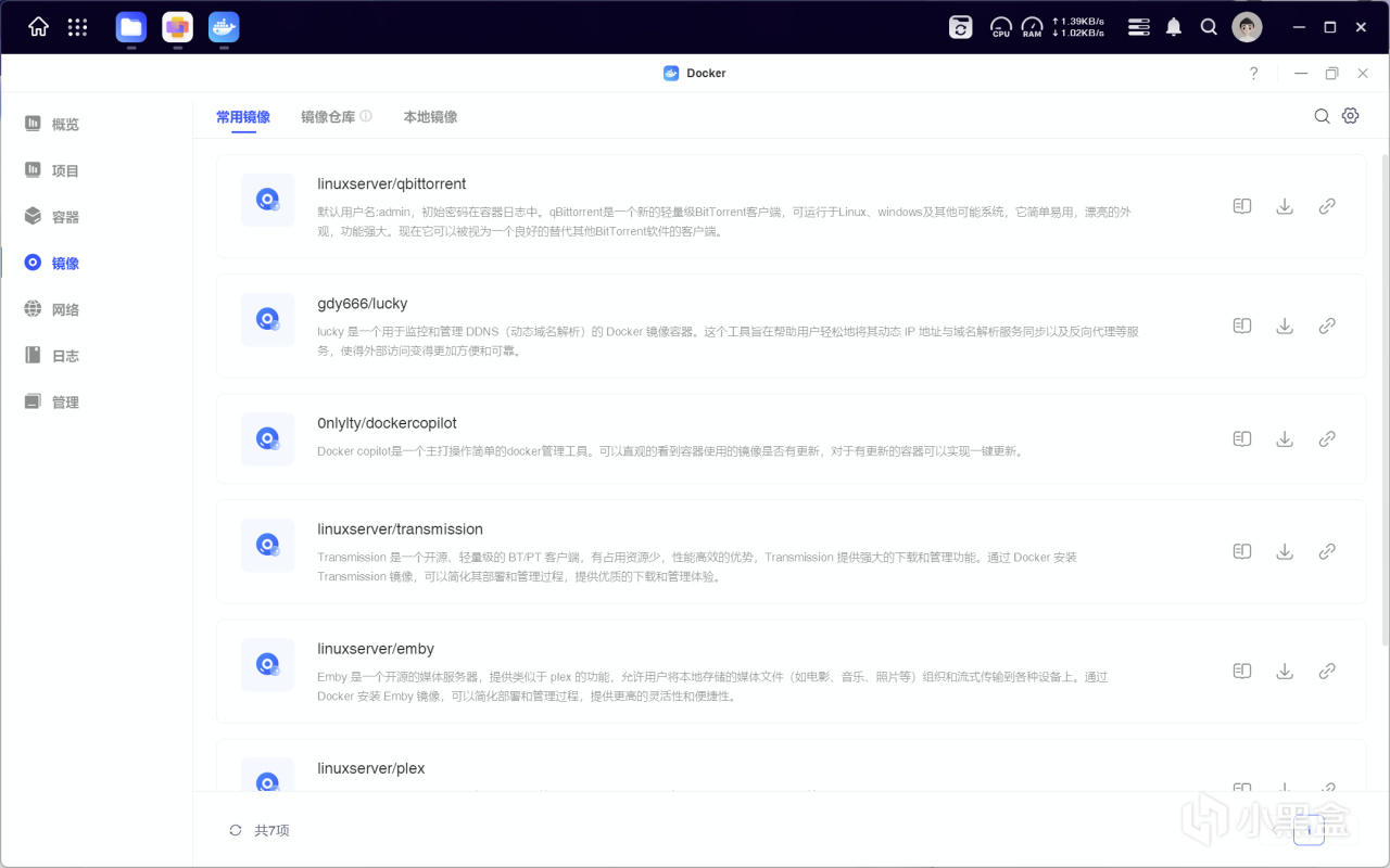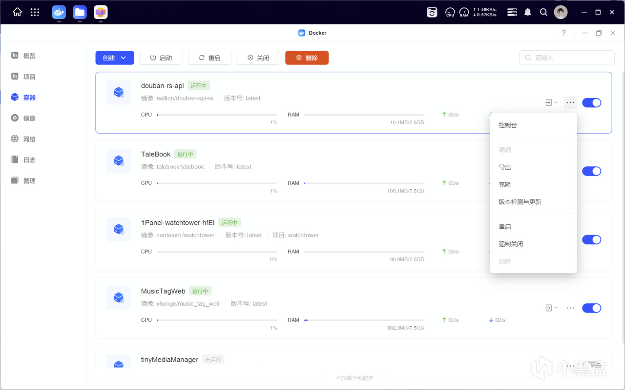 这里就是一个对已安装容器的总览,可以查看Docker的运行情况,支持导出、克隆、检查更新等操作。