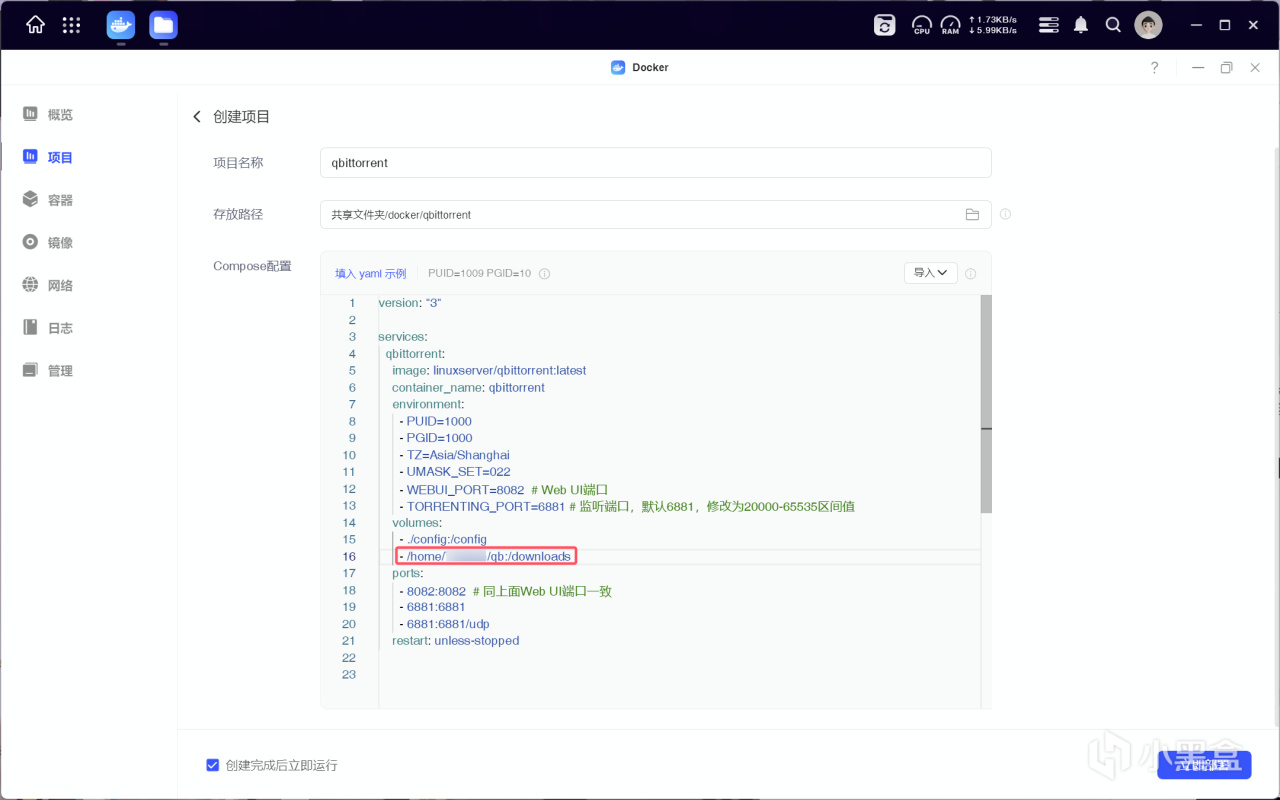./ 表示在当前文件夹下,什么意思呢?就是在【存放路径】对应的文件目录下,完整解释为:Docker部署后,会自动在 共享文件夹/docker/qbittorrent 下创建一个config文件夹用于存放qbittorrent的数据配置文件。完整的就是 共享文件夹/docker/qbittorrent/config。