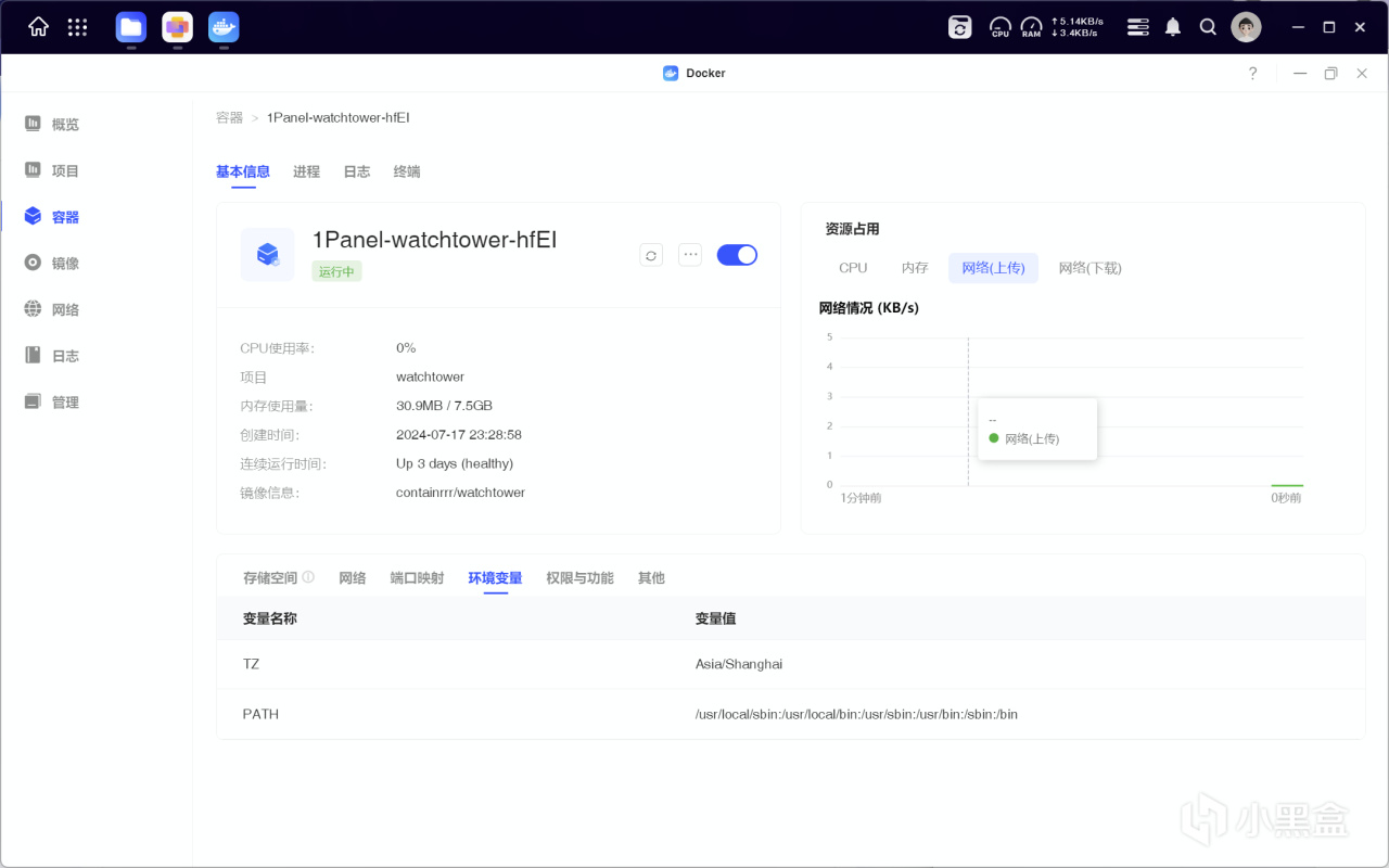 【资源占用】的CPU、内存不必说,各家都有。但是绿联添加了网络数据监控,可以总表,也可以点击【容器选择】,单独查看某个镜像的网络情况,发现网络异常可以快速排查,这点非常不错;