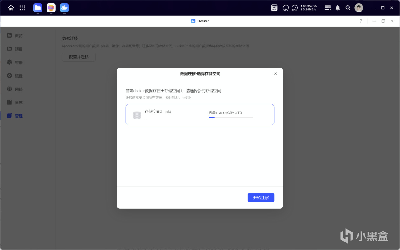 说白了就是Docker 数据迁移,如果起初存储空间容量不足,或者起初将docker部署在机械硬盘内而后续因性能需求需要迁移至固态硬盘时,可在这里进行整体迁移。