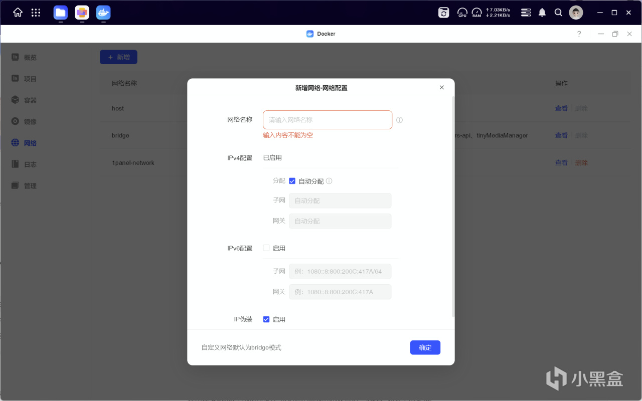 在创建 Docker 容器网络时,可以根据具体需求设置这些选项。如果不需要特殊配置,可以使用默认设置。如果有特定的网络要求,如自定义 IP 范围或需要启用 IPv6,可以在这里进行相应配置。确保填写的网络名称唯一且符合你的命名规范。完成配置后,点击“确定”以创建新网络。