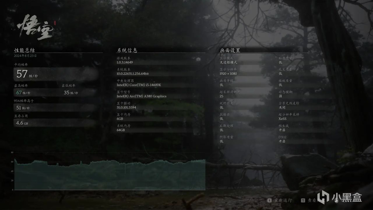 ▼1080P分辨率,全低画质,开启DX12与帧生成,超采样使用XeSS,得到57帧/秒的成绩,最高帧率67帧/s,最低帧率35帧/s,畅玩黑猴妥妥的没问题。