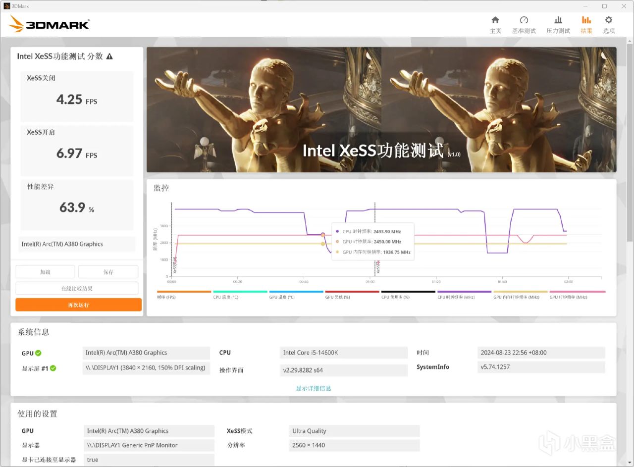 ▼另外蓝戟A380 PHOTON 6G OC 毕竟还支持XeSS,性能提升在63.9%,实际游戏性能会有进一步提升,和GTX 1660 五五开不是问题。