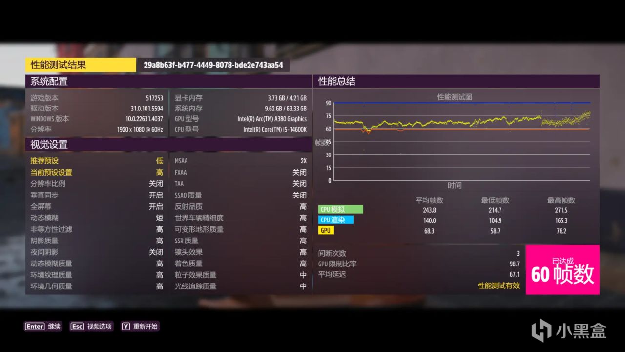 ▼《地平线5》开启高画质,1080P分辨率GPU渲染也能达到68.3帧,蓝戟A380 Photon 6G OC 入门级甜品卡妥妥的。