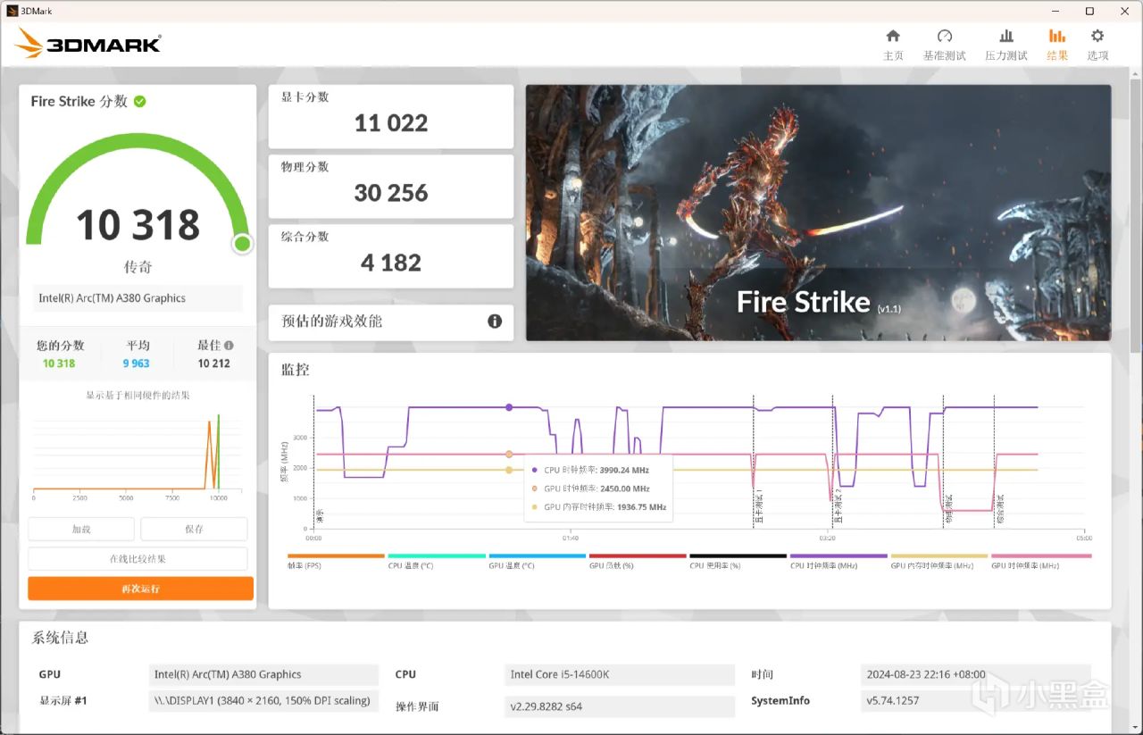 ▼测得Fire Strike跑分10318分,显卡分数11022分,物理得分30256分,显卡性能分值大约是N卡4060 的40%,但是能与N卡GTX 1660旗鼓相当。