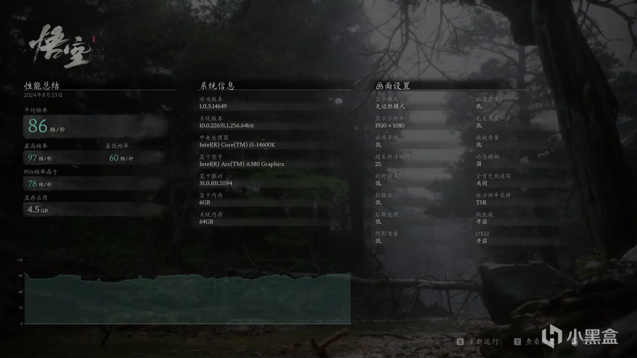 ▼拉出来《黑神话·悟空》进行测试,1080P分辨率,全低画质,开启DX12与帧生成,超采样使用TSR,得到86帧/秒的成绩,最高帧率97帧/s,最低帧率60帧/s。