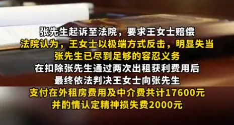 法院认为,王女士以极端方式反击,明显失当,张先生已尽到足够的容忍义务,在扣除张先生通过两次出租获利费用后,最终依法判决王女士向张先生支付在外租房费用及中介费共计17600元,并酌情认定精神损失费2000元。
