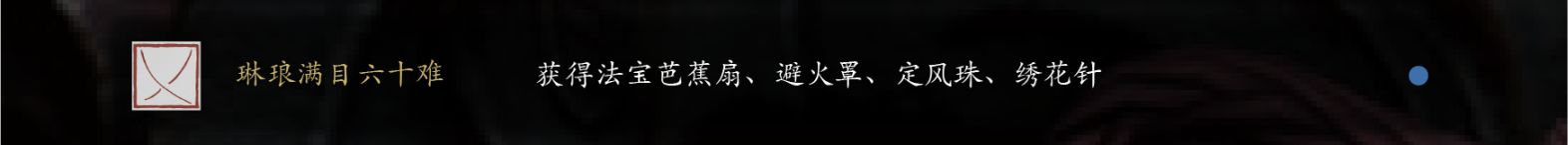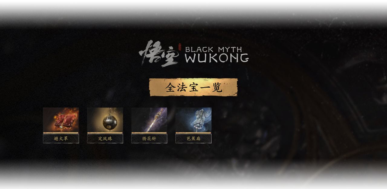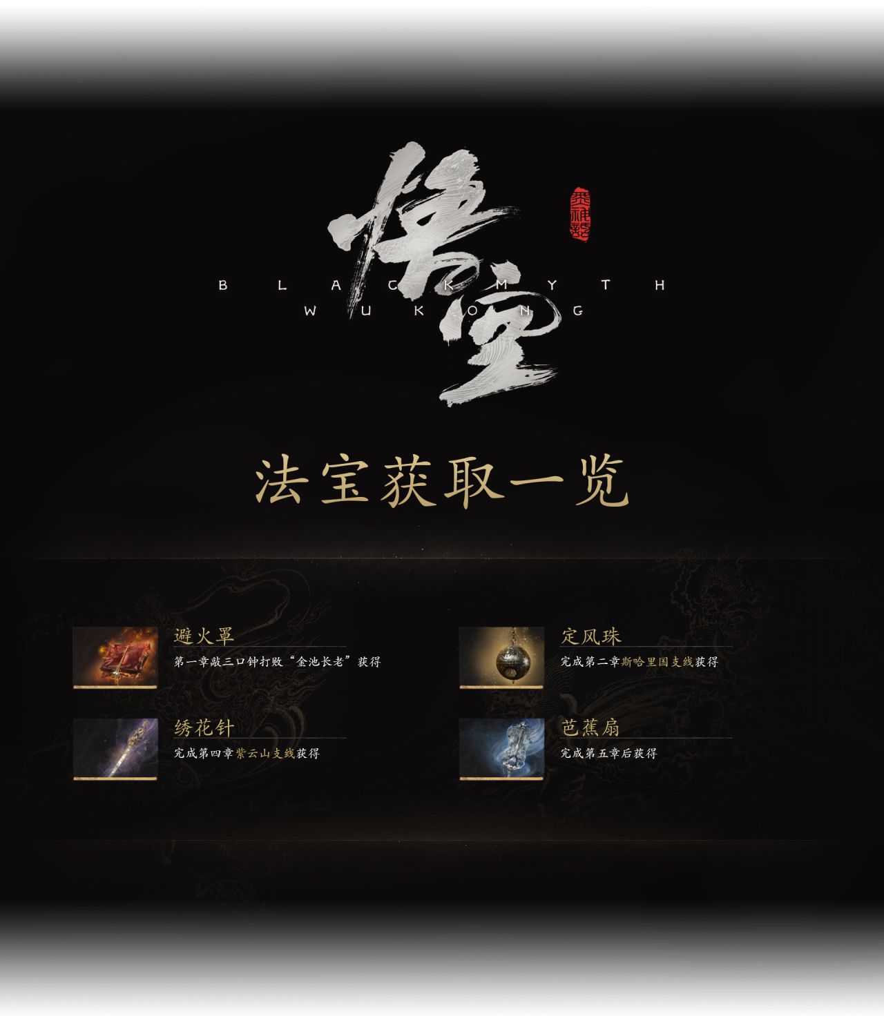 法寶的獲取沒什麼好說的,只要好好做支線都能收集齊全。這邊姑且說一下每個法寶的比較實用的點,避火罩在打黑熊精有奇效,以及第五章和第六章有妙用免疫燙傷。定風珠打黃風大聖有奇效,可用於擊退其它boss獲得一定時間免傷。繡花針對於百目魔君有奇效,芭蕉扇對楊戩有奇效。