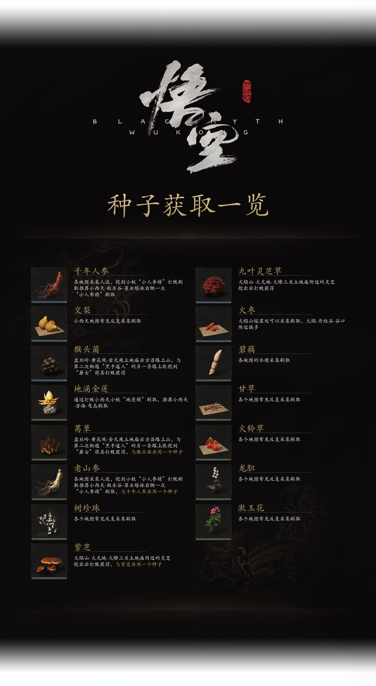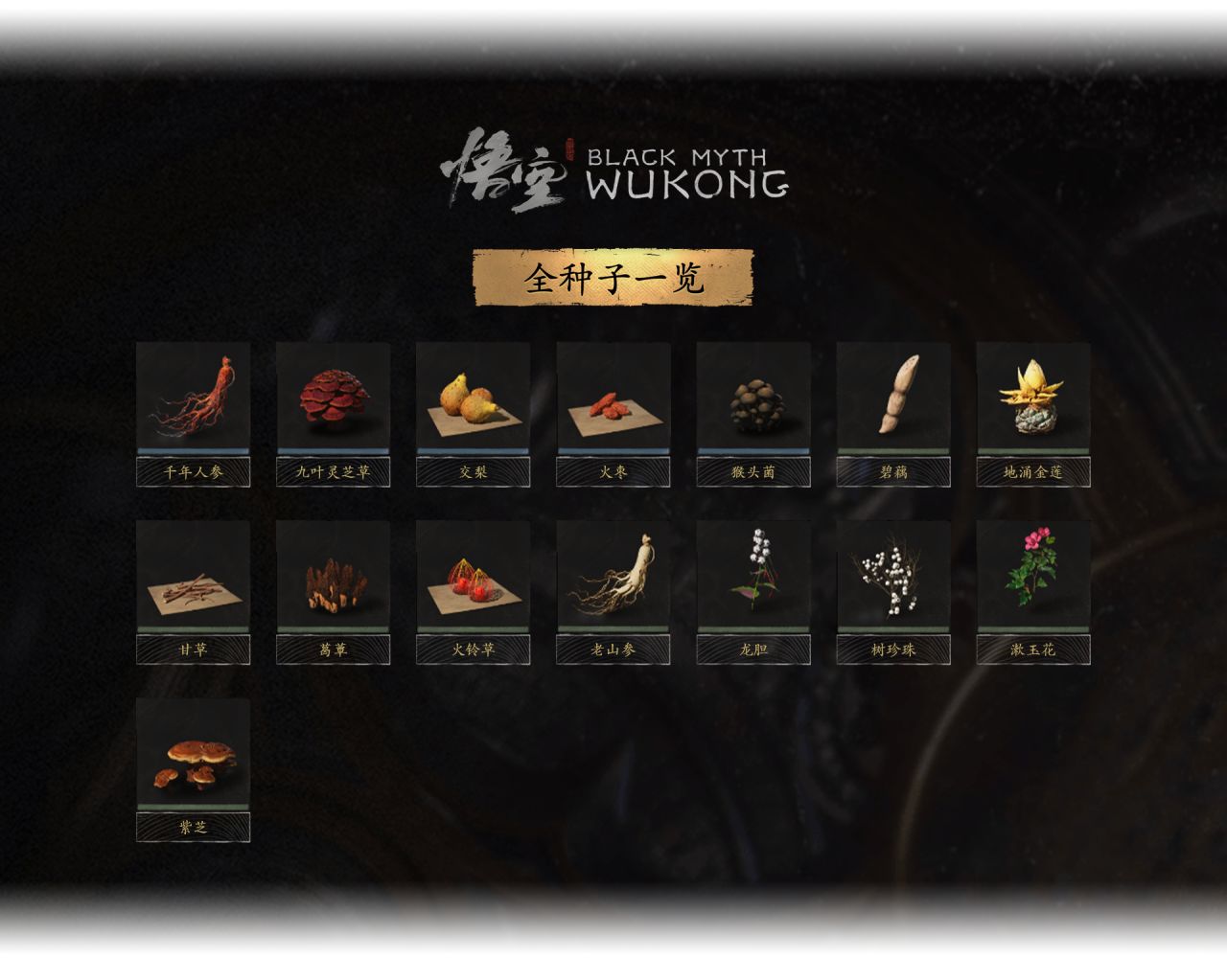 雖然植物有15種,但是需要的種子只需要12個,其中有6個植物會共用3個種子。大部分都是可以採集刷取或是打特殊boss拿到,建議碰到植物就採,免得後面補折磨。其中地湧金蓮和千年人蔘種子需要打小怪刷取,建議自行查找視頻查找最佳刷取方案。