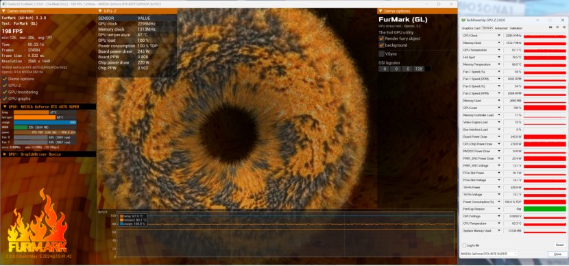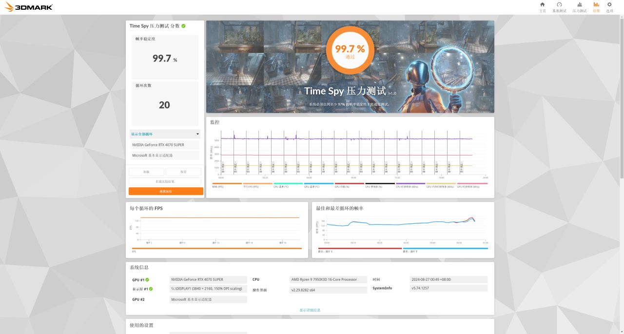 最后看下散热测试,单烤GPU20分钟,此时显卡温度稳定在67°C,Hot Spot温度79°C,核心频率稳定2295Mhz,功耗245W。TimeSpy的20轮循环压力测试中,最终成绩99.7%,稳定的一批。