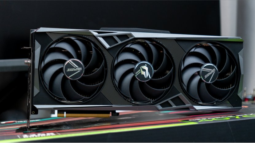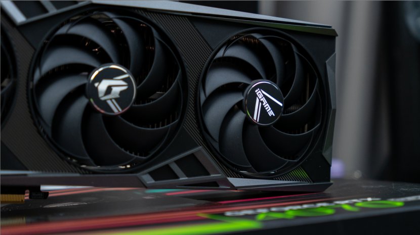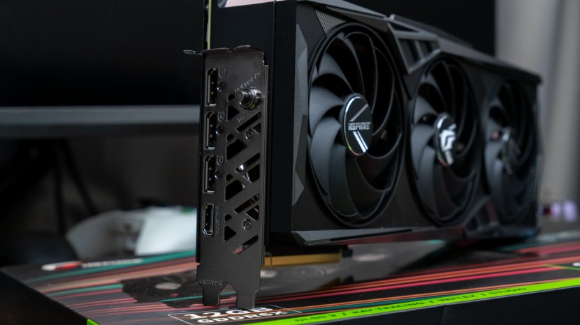 显卡正面是印着iGame字样的三把支持自动启停的9cm风扇,背面则是三个DP1.4a+HDMI2.1a输出接口,此外在背板上还有一个Turbo按钮,按下后显卡会自动超频运行。