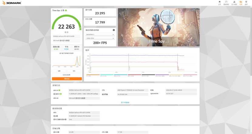 最终我这张iGame GeForce RTX 4070 SUPER火神显卡卡在核心频率超200MHz,显存频率超频1000MHz过测。此时的Timespy分数达到了23200分,相比默认成绩大概提升了7%。