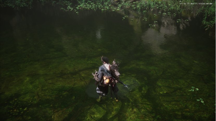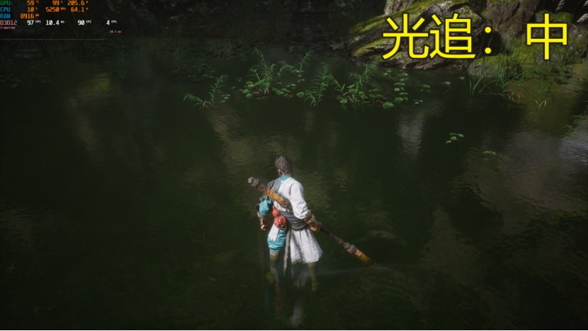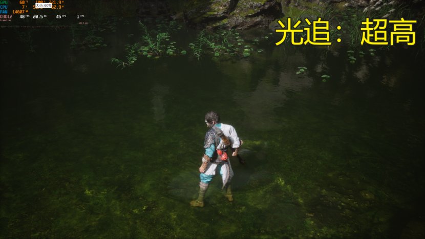 要说明的是《黑神话:悟空》这次有两种光追,一种是虚幻引擎的lumen光追,在游戏中将光照效果设置到高以上就会自动开启。另一种则是NVIDIA的路径追踪(即全景光线追踪),需要开启超高档位后游戏中的水面才有反射和折射效果,大大增加游戏的代入感和真实度。