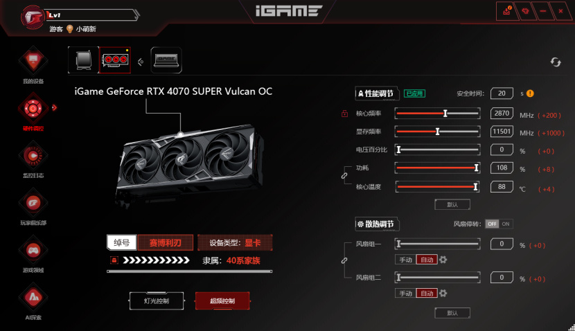 在iGame Center中可以快速的对显卡功耗、频率等参数进行调整。而且比较贴心的是,在调整参数后iGame Center会自动给显卡加一个持续20秒的轻度负载,来验证超频后是否可以正常运行。