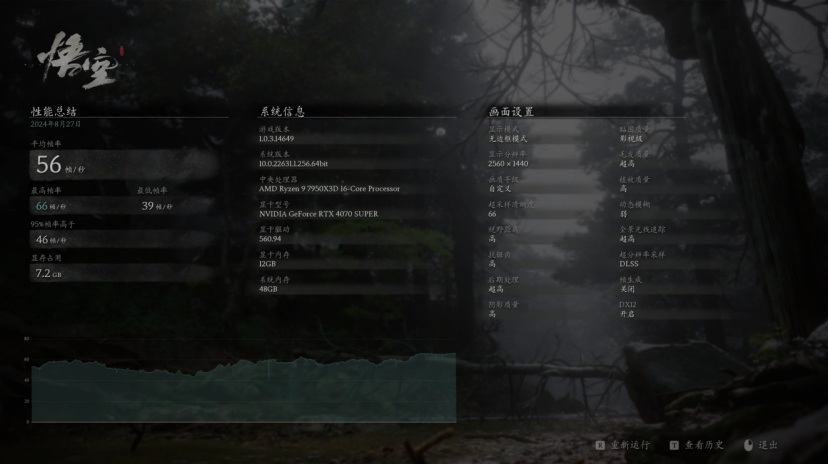 于是调整出了一套对画面观感影响较小,更适合日常跑图时的设置。依旧维持全景光追不变的情况下,不开启帧生成,在BenchMark中帧数上升到56帧,算是可以正常游玩了。