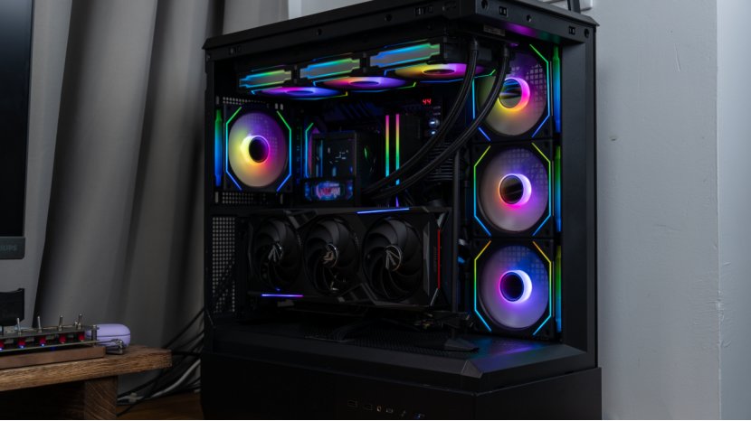 不过受机箱体积的限制,星灿大岚在竖装火神显卡时并不能使用底部的进气风扇,而且你如果和我一样用的是带屏水冷,火神的小屏幕会和冷头的小屏幕发生一定冲突,这点需要注意。