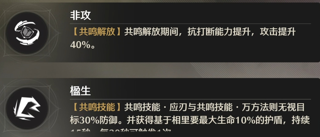 【非攻】和【楹生】优先级并列,一个开大时加40%攻击,一个技能穿透30%防御。