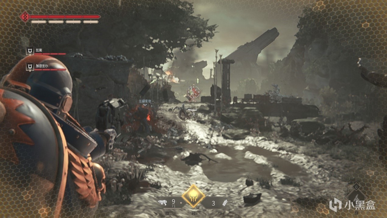 极限战士在游戏中的塑造,便是一副肌肉猛男的形象(很帅!),他们穿着动力盔甲,右手链锯剑,左手重火力,远程枪械突突突,近战刀剑砍砍砍。