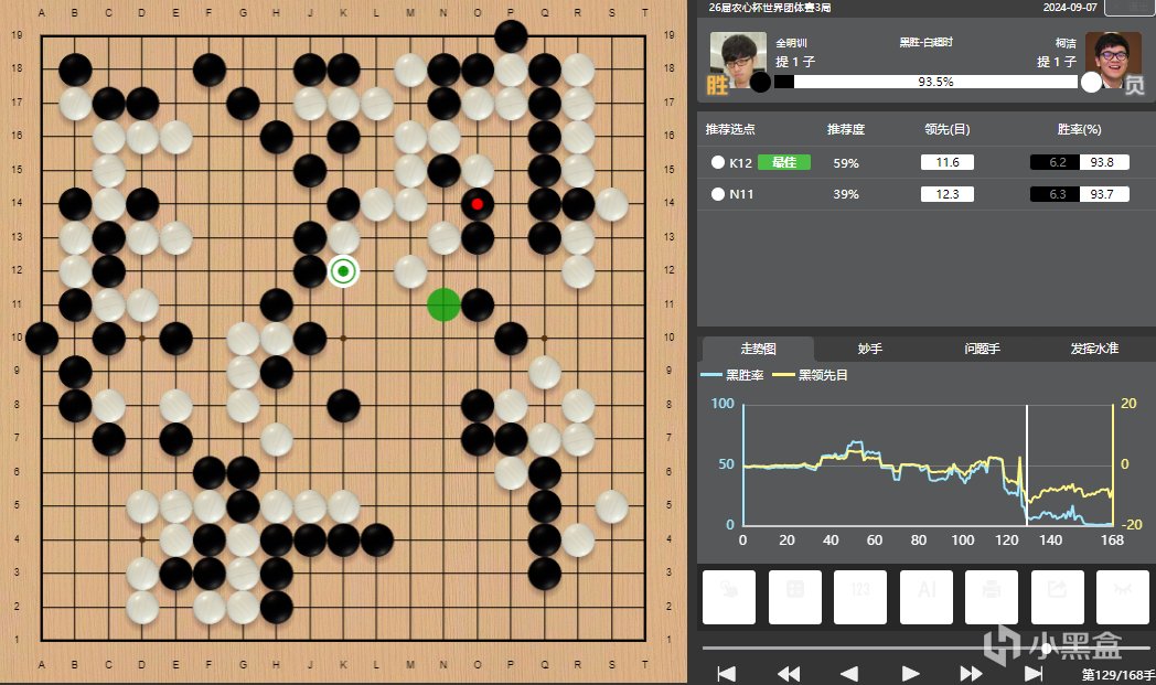 9月6日第二輪,柯潔面對日本先鋒廣瀨優一,一場毫無懸念的碾壓大勝;今天下午第三輪,柯潔再面對韓國二將金明訓,柯潔執白,雙方落子如飛,局勢黑棋小優,很快局勢就進入了柯潔的經典混戰狀態,右上的白棋大龍陷入黑棋的包圍。
