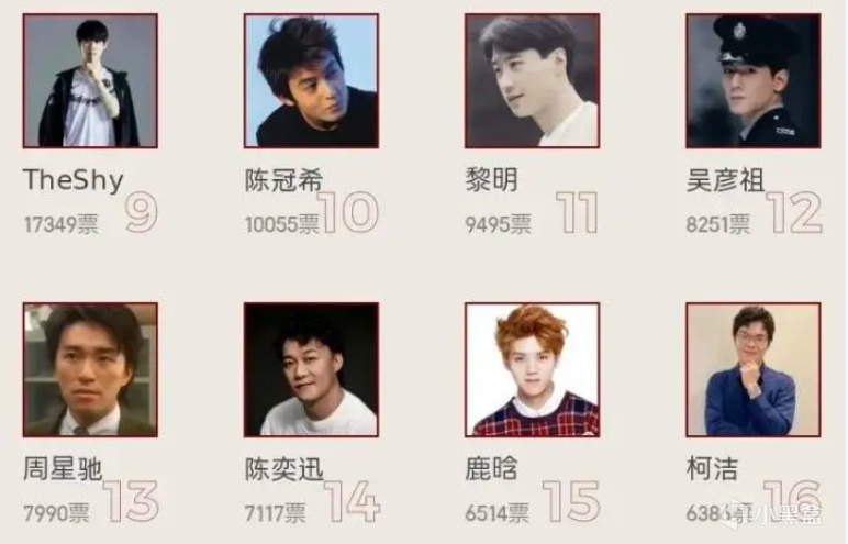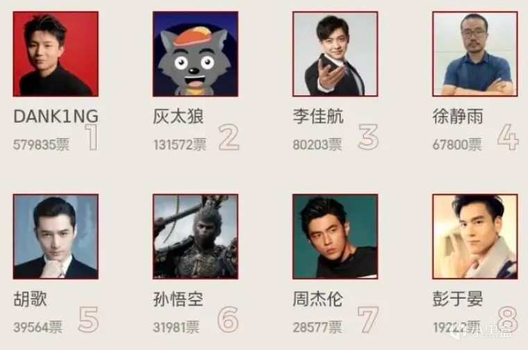 遊戲和電競領域,TheShy以第9名晉級16強,DANK1NG第一,《黑神話:悟空》中的孫悟空爲第六,虛擬人物灰太狼第二,徐靜雨作爲解說排在第四,胡歌第五、周杰倫第七、彭于晏第八、陳冠希第十。