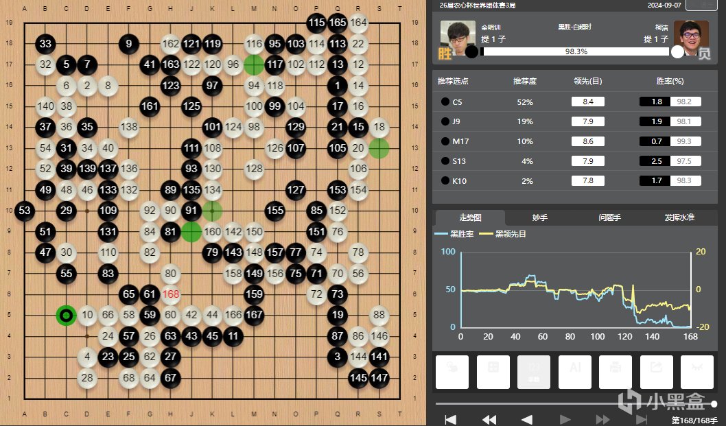 接下來柯潔黑棋第169手,這裏星陣的勝率給到98%,已經是毫無懸念的比賽,但是柯潔出現了非常非常非常罕見的拍鍾超時,按照農心杯賽制,棋手只有一次60秒讀秒,超時就會判負,最終柯潔無奈贏棋局面被判超時負,遺憾輸掉比賽。