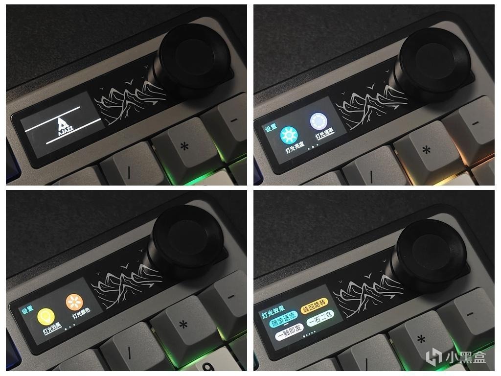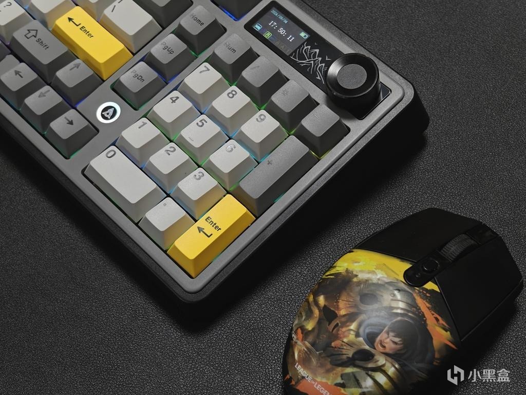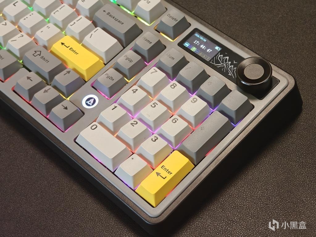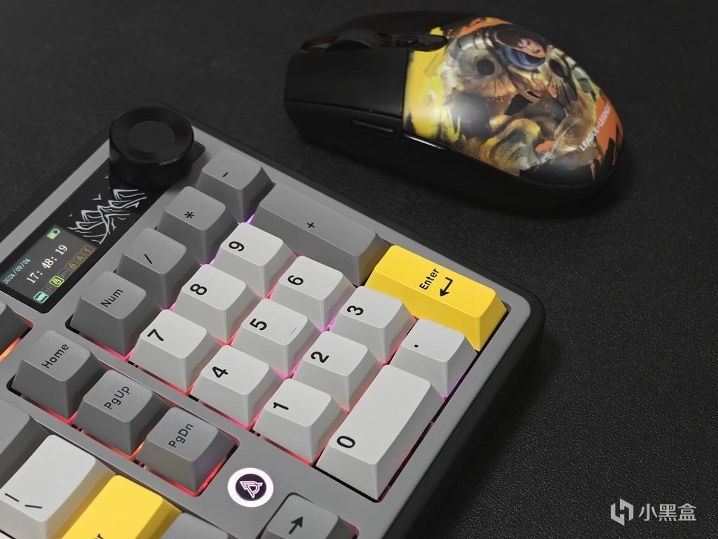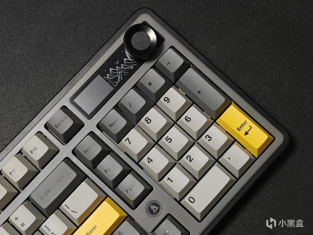 键盘右上方分布了一块彩色LCD屏幕以及一枚金属旋钮,屏幕右侧还有山川图案的装饰,细节满满。为了给屏幕和旋钮让位,功能键和RGB指示灯移到了数字键盘和主键区中间;