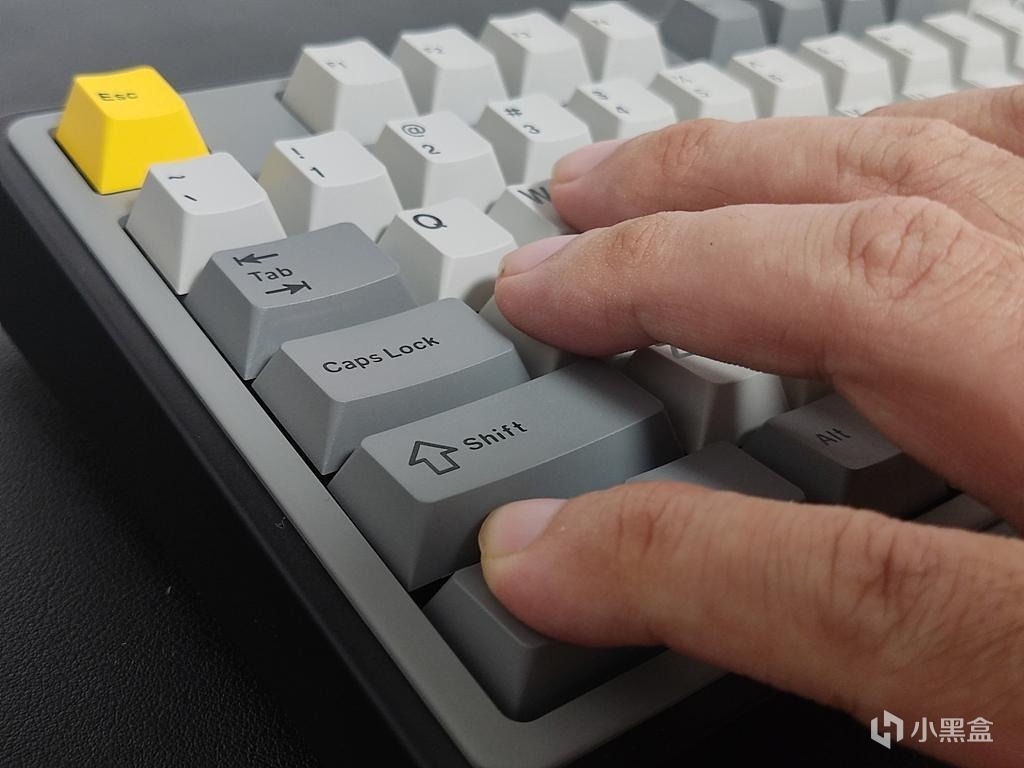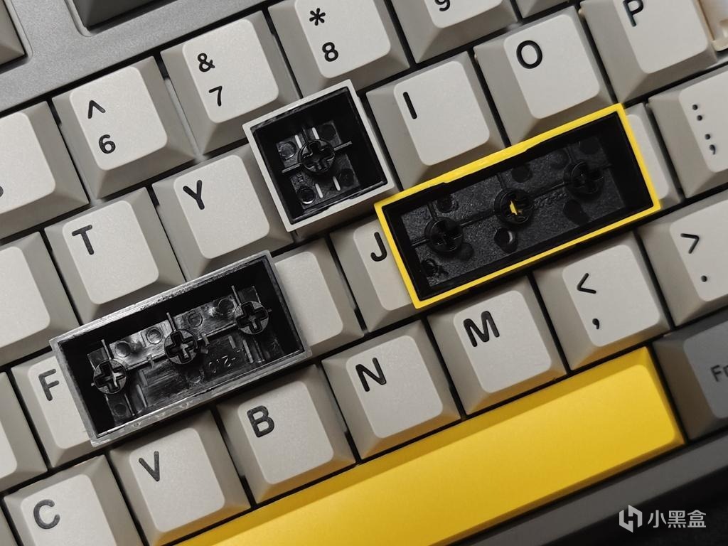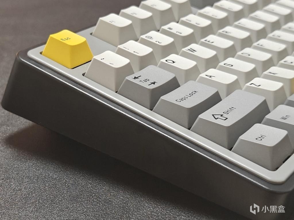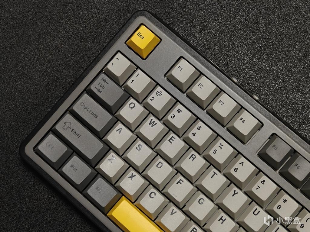 黑爵 AK980采用一套黑色字体、原厂高度、PBT材质的二色键帽,深灰、浅灰和黄色三拼配色,美观大方。键帽做工很好,键帽壁很厚,触感细腻,长时间使用不易打油。