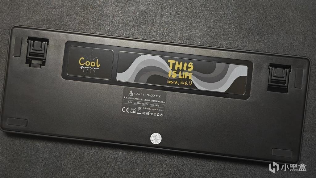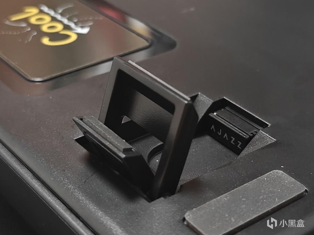 除了背板个性插画,键盘背面还有四块黑色防滑垫以及一对二段式脚撑,2.4G收纳仓也隐藏在脚撑下方;