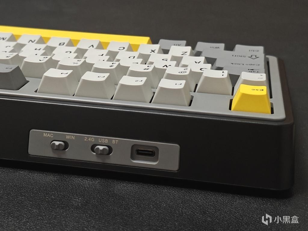 键盘左上侧设有MAC/WIN系统切换键、2.4G/USB有线/蓝牙切换开关;充电口还作了内凹设计,开口较大,美观的同时兼容性更好,可以搭配各种客制化航插线使用。