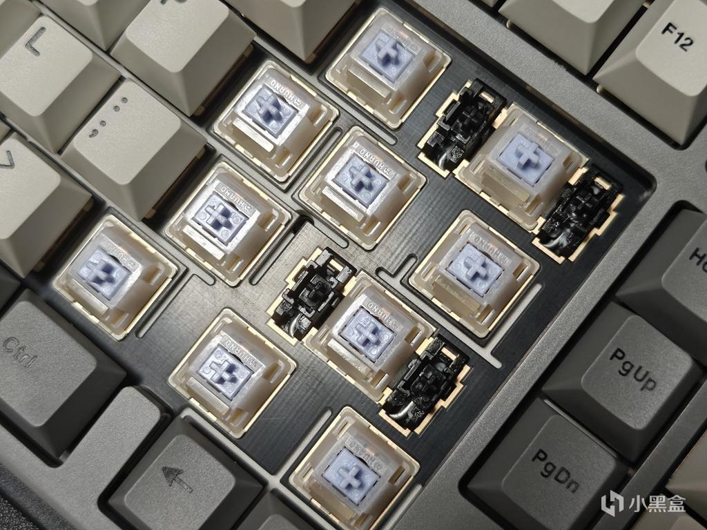AK980支持全键热插拔。大键位采用厂家精润的黑色卫星轴,到手即用。中高配版采用FR4单键开槽的沉金定位板,使拔插轴体更加顺畅的同时,增加打字软弹度。下灯位设计还可以搭配侧透键帽使用。