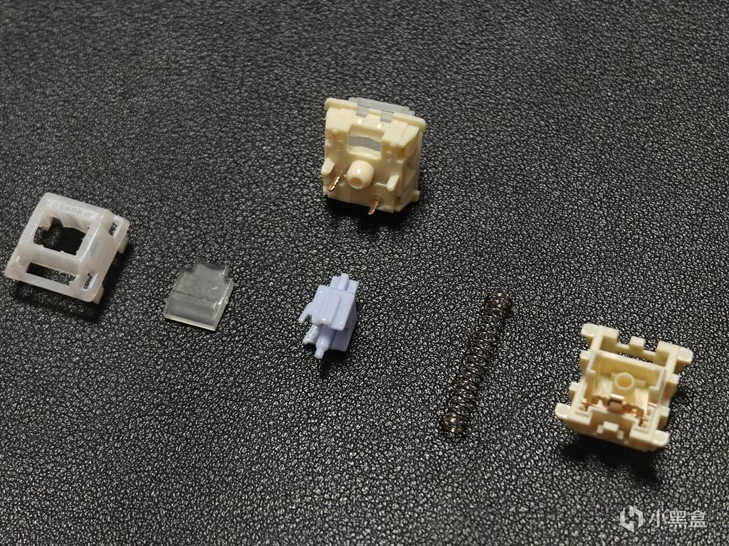 轴体拆截图如上,轴芯为LY材质,底部做了加长,导轨和弹片经出厂厚润,搭配22mm单段弹簧,按起来很顺滑,回弹较快,声音也很HIFI,玩游戏很合适。