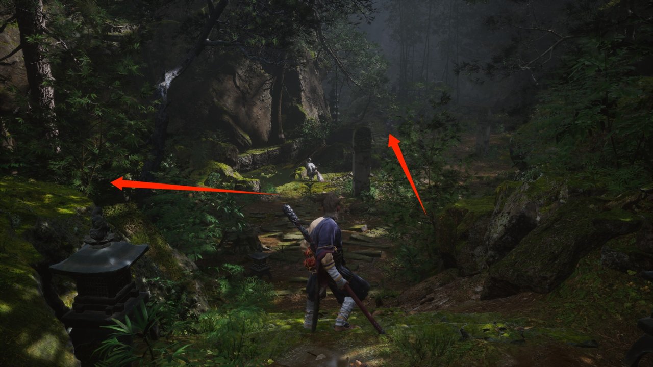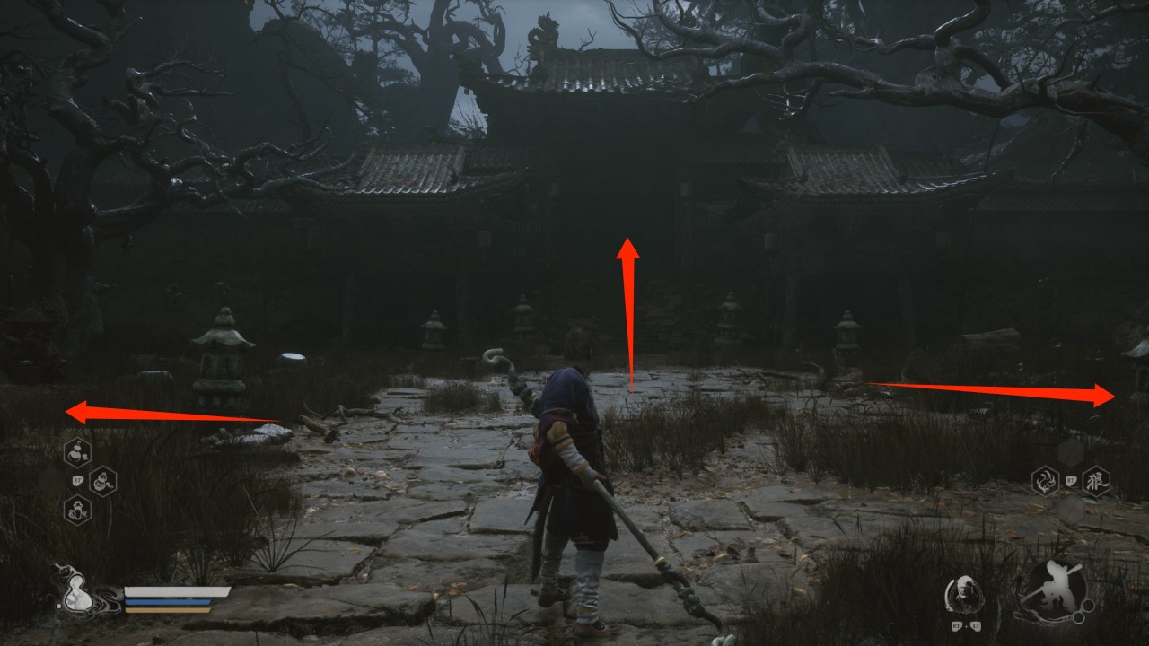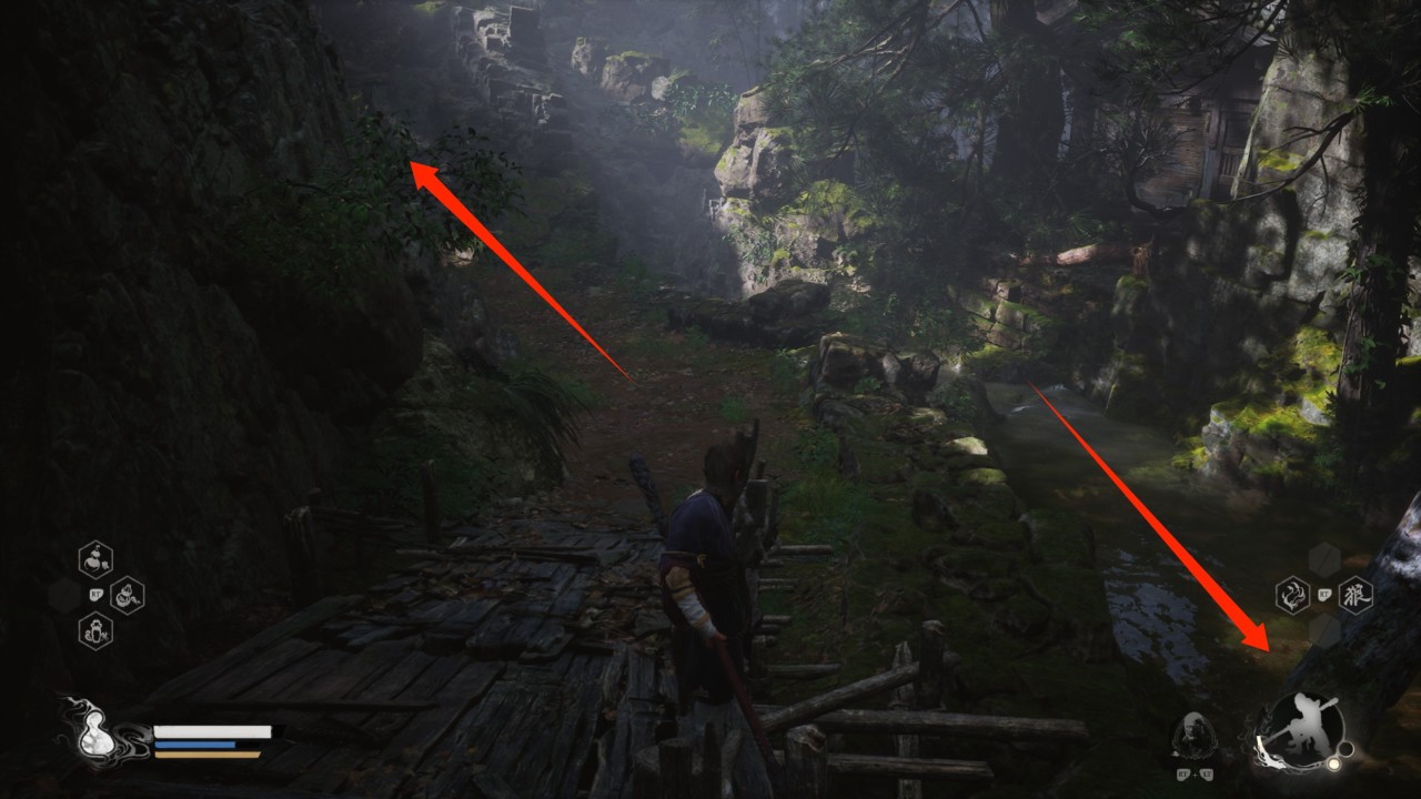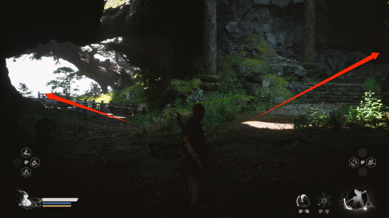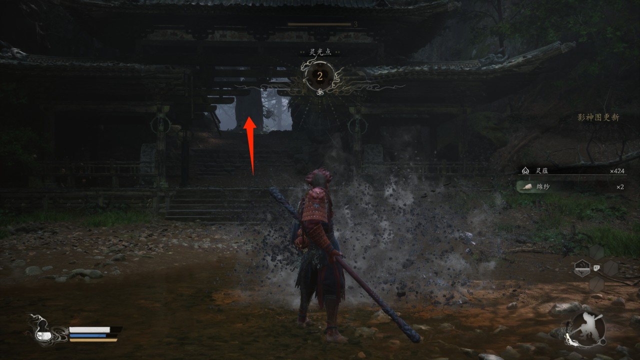 過土地廟順着大道走有三條路,走右邊有一隻較強小怪鴉香客和一個鬼火(收集獲得靈蘊),去不去都不影響。正前面除了小怪和一些收集物也沒什麼東西,主要是走左邊。