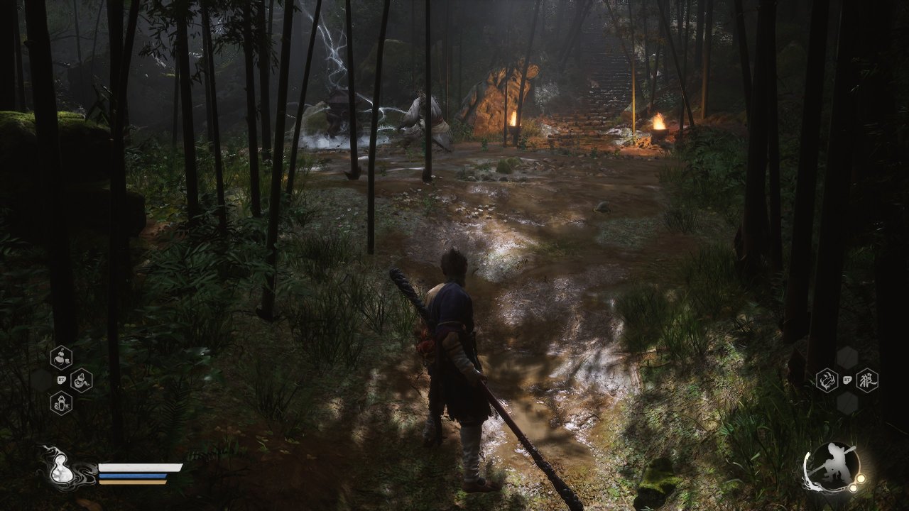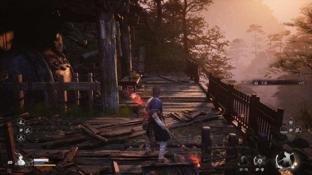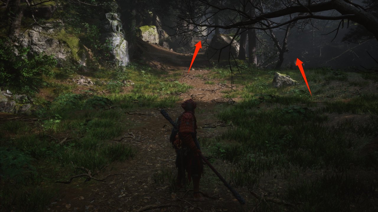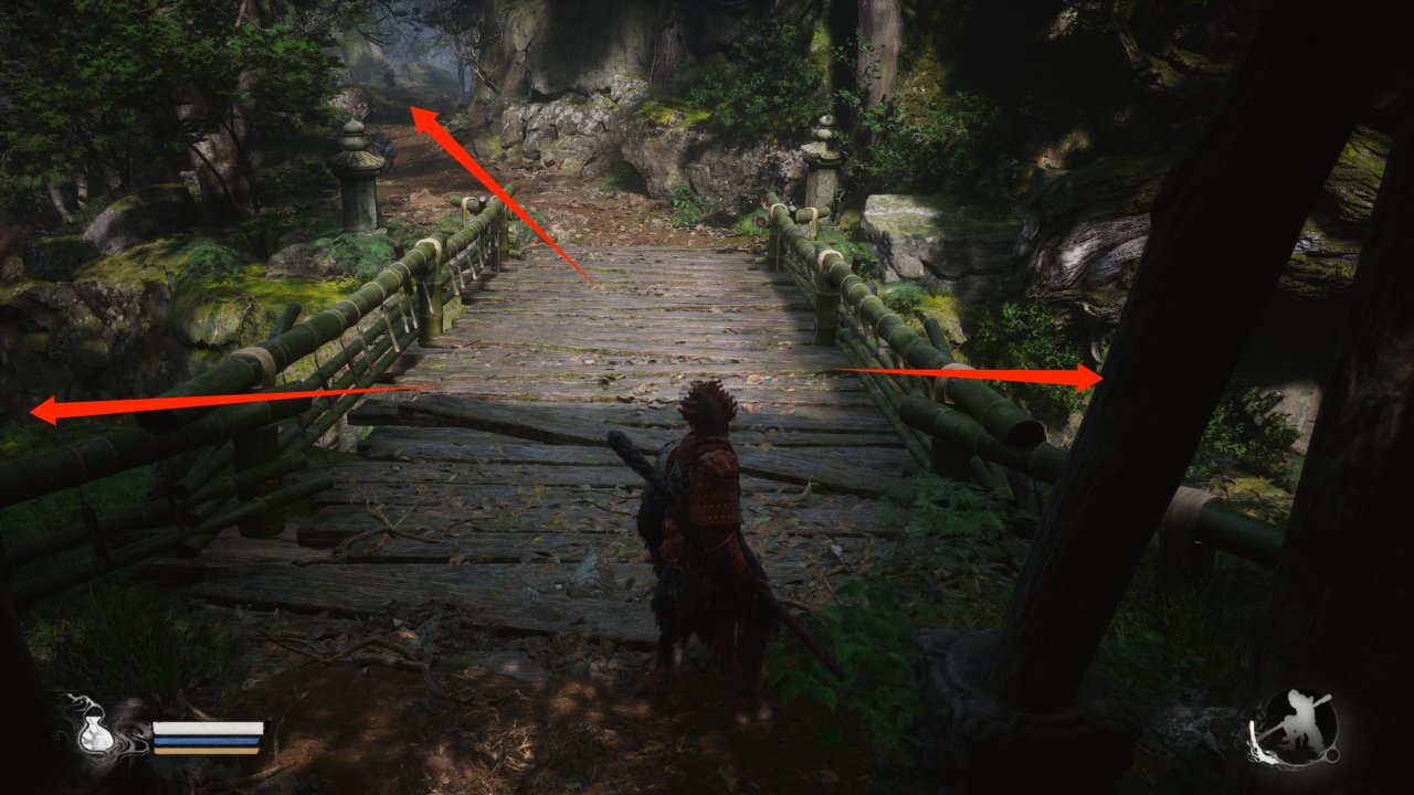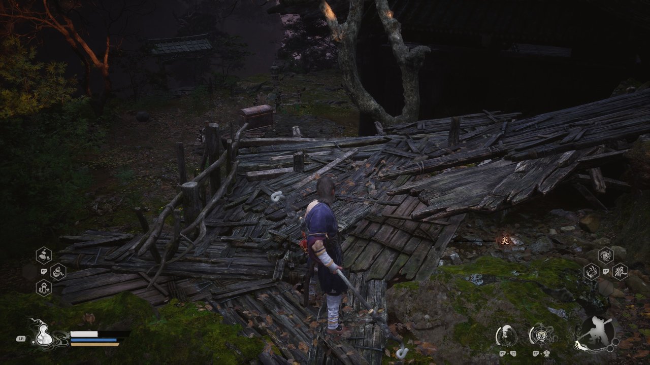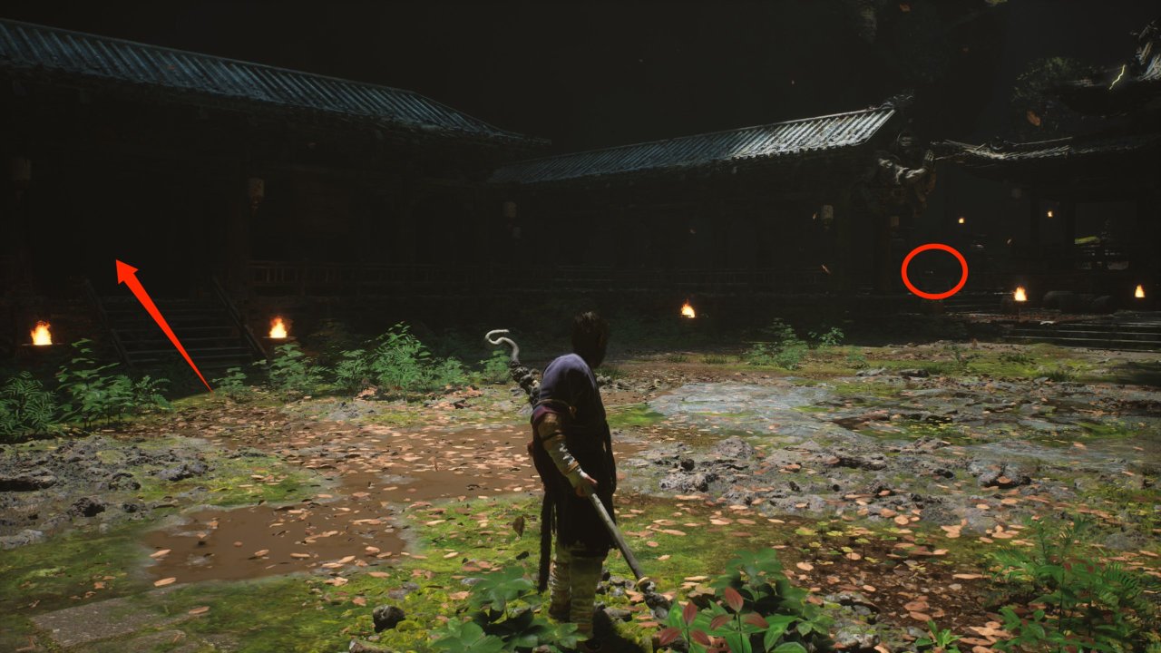 過土地廟順着大道走有三條路,走右邊有一隻較強小怪鴉香客和一個鬼火(收集獲得靈蘊),去不去都不影響。正前面除了小怪和一些收集物也沒什麼東西,主要是走左邊。
