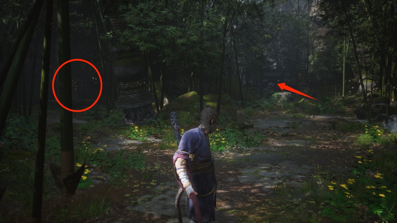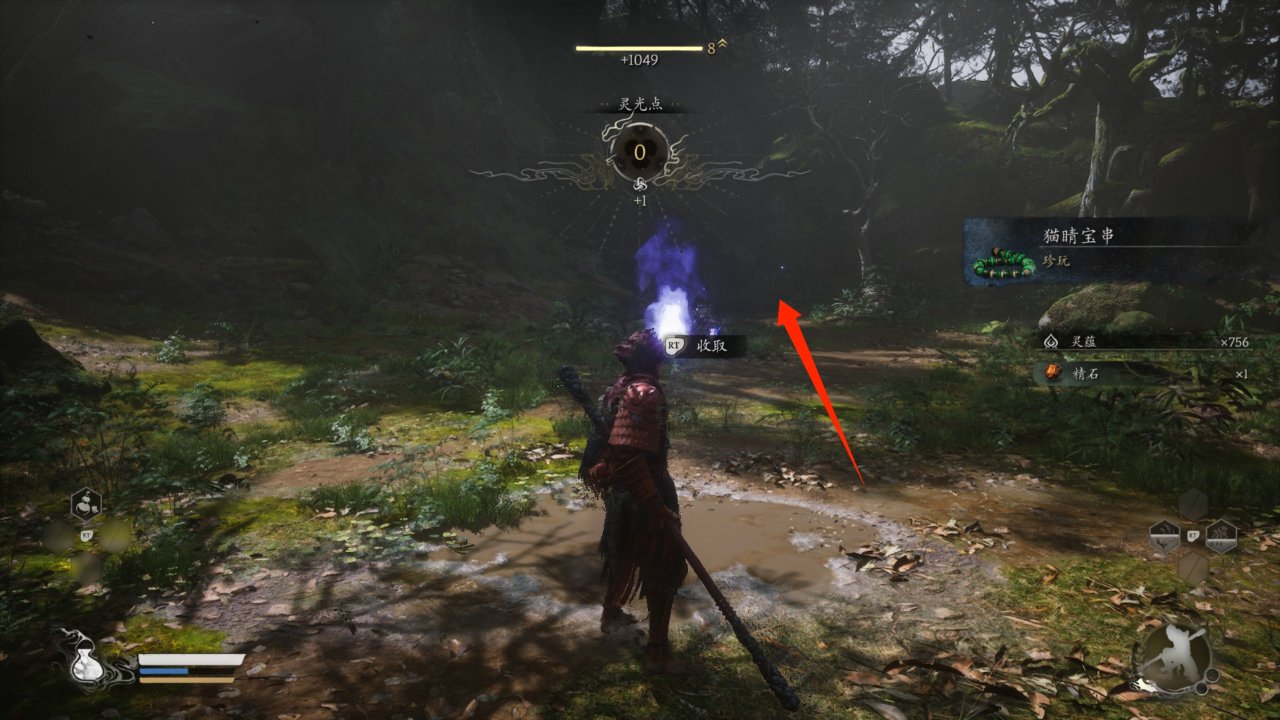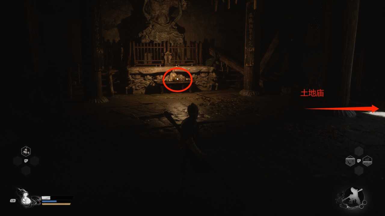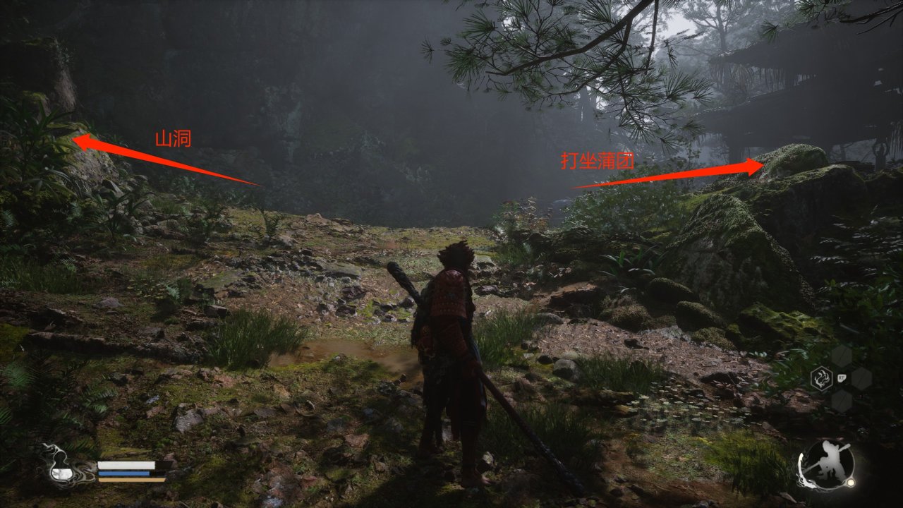 沿着山坡直走,來到一處小空地,右邊可以看到一個【打坐蒲團】(1/3),打坐後獲得一個靈光點(技能點),罈子可以打碎,給一點點靈蘊。完成後穿過山洞來到下一處土地廟。