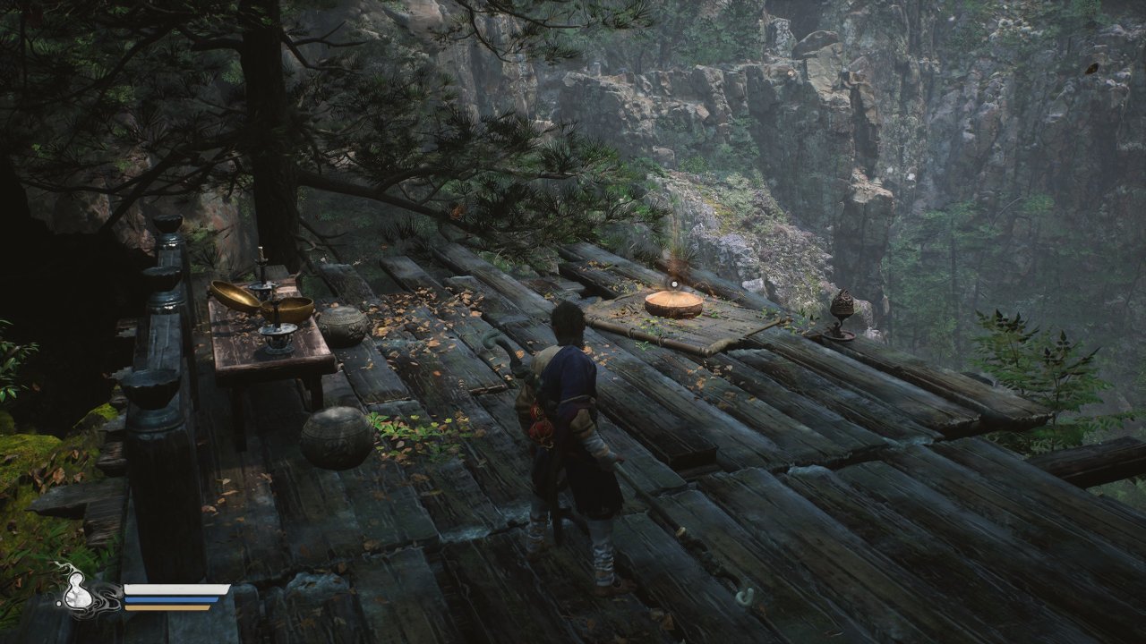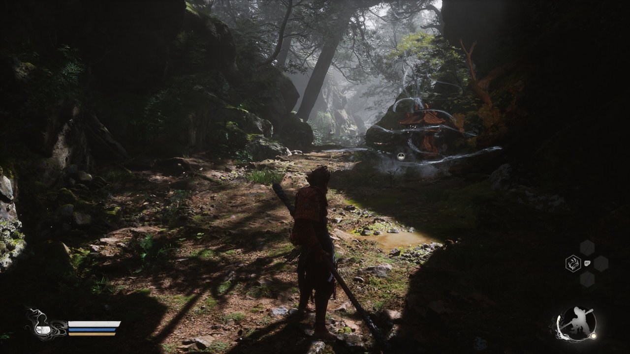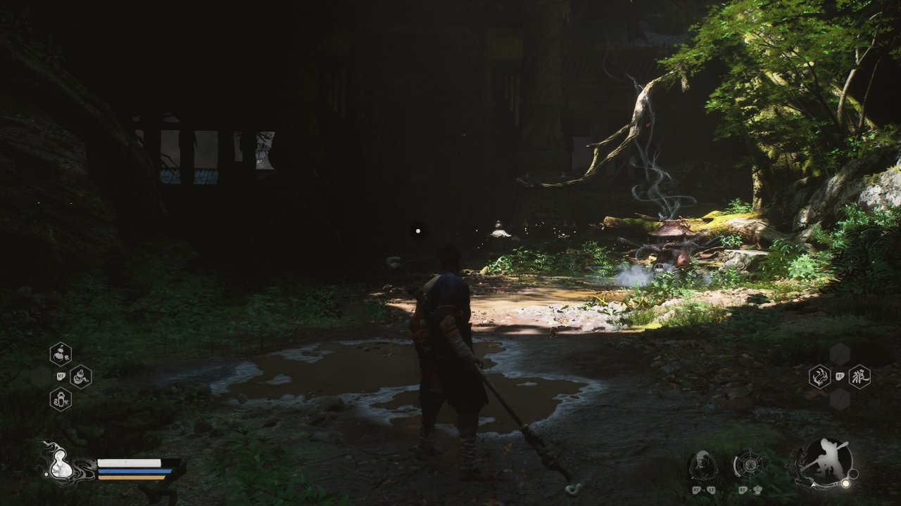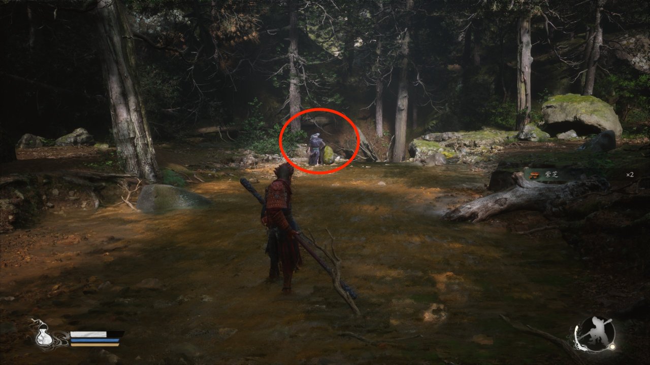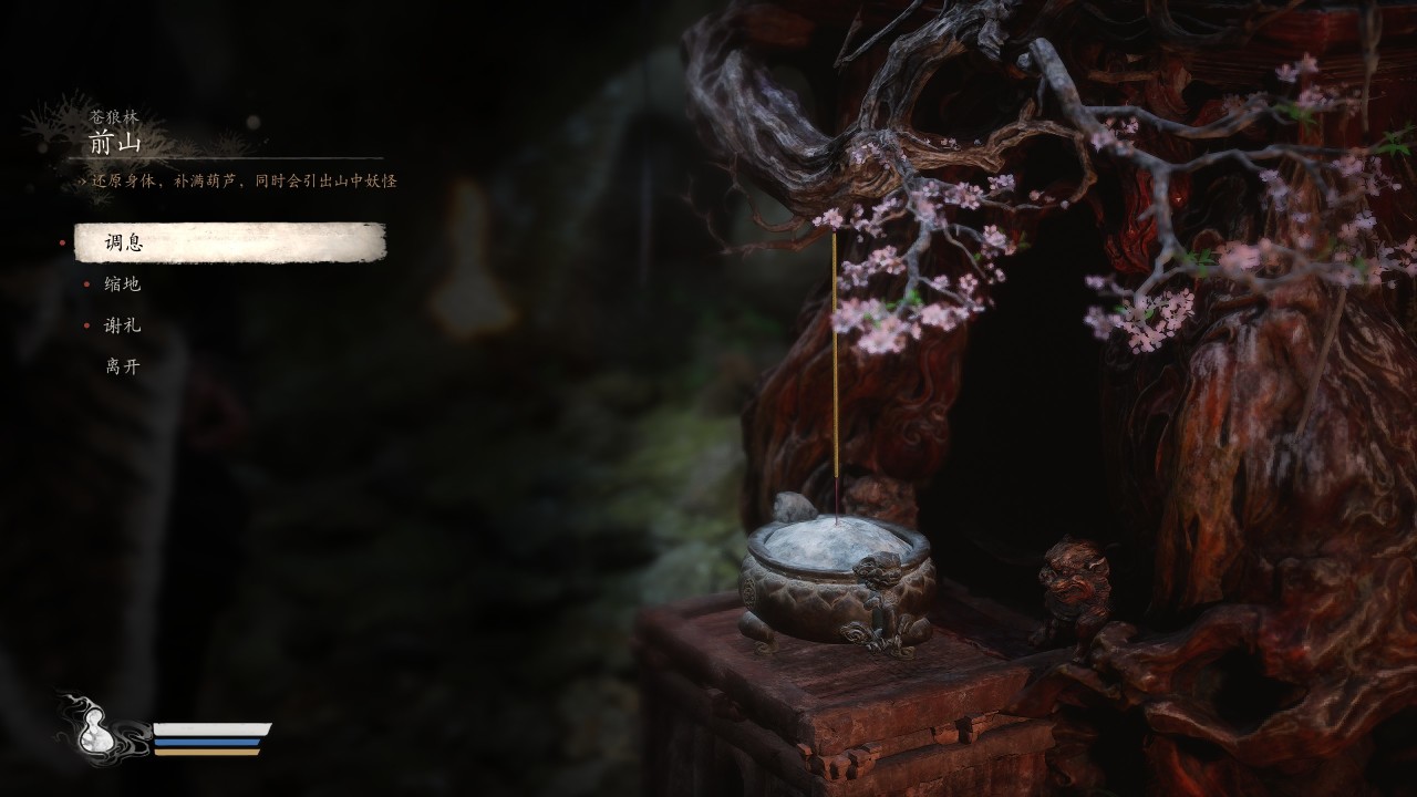 沿着山坡直走,來到一處小空地,右邊可以看到一個【打坐蒲團】(1/3),打坐後獲得一個靈光點(技能點),罈子可以打碎,給一點點靈蘊。完成後穿過山洞來到下一處土地廟。