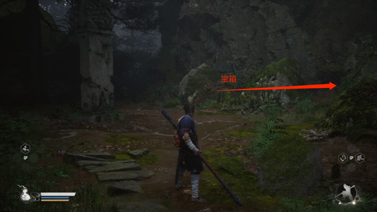 出洞沿主幹道往前走,路過一個石碑前往右走,可以發現一個寶箱,拿完繼續上路。